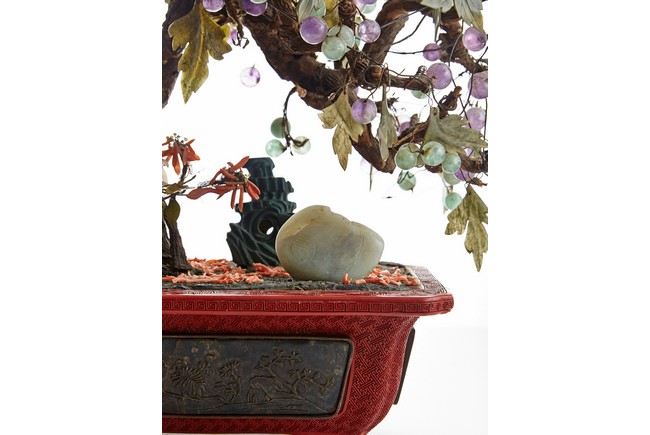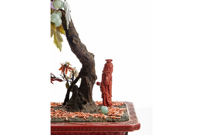 The composition includes a finely carved cinnabar lacquer planter carved with key-fret patterns with four panels of flowers inset on the sides,a carved coral elder figure,a turquoise carved rockwork,a white jade carved swan,and a tree completed with semi-precious gems depicting grapes and jade leaves,the ground also covered with coral pieces. Qing Dynasty period