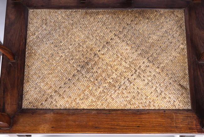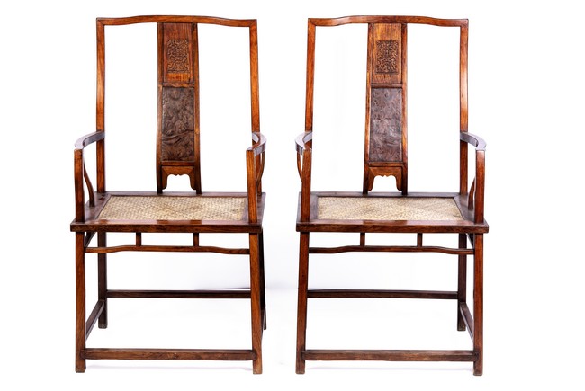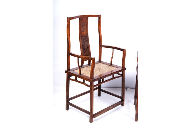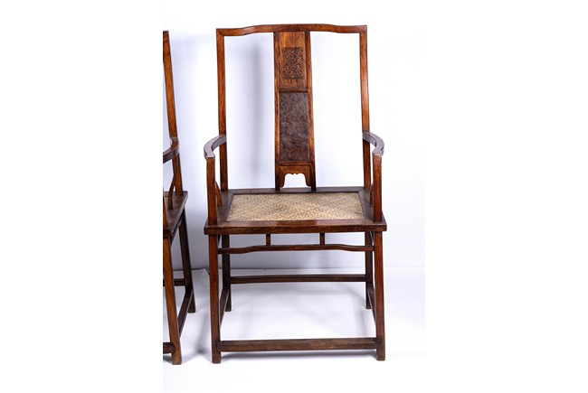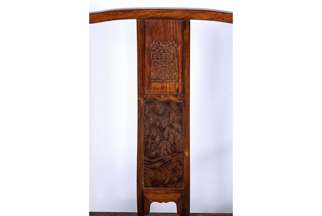 With a slightly arched crestrail above a curved splat carved with a rectangular panel enclosing pair of stylized chilong above burlwood inset,the S-shaped armrests of square sections continuing in a curve to the corner posts with mid-section support,with later replaced hard cane seat, the front and sides with humpback stretchers with vertical struts. Qing Dynasty period.