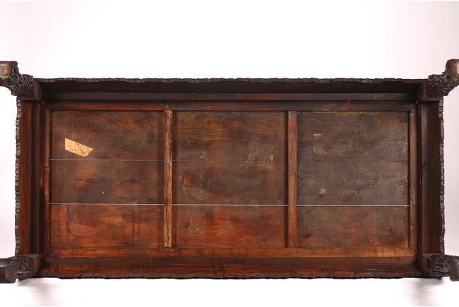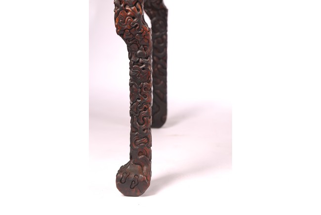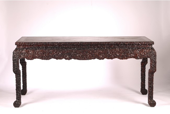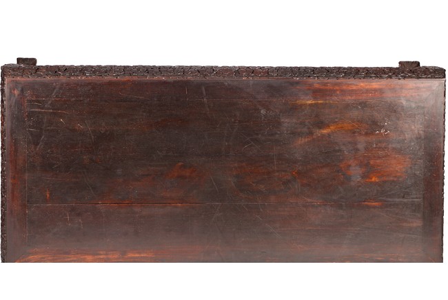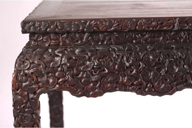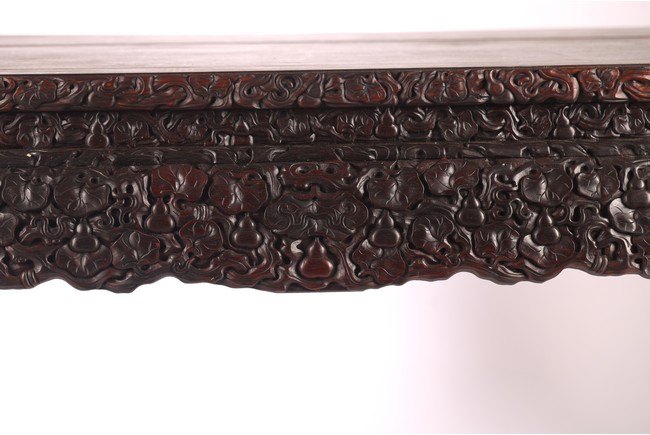 The rectangular top set within a frame above a waist and beaded apron carved with dense pattern of leafy gourd vines,continuing down to the four legs ended in hoof feet. Qing Dynasty period.