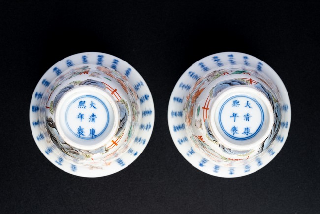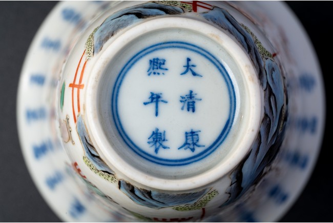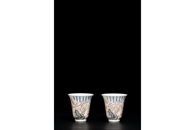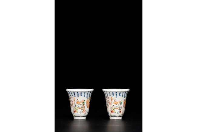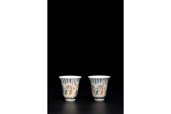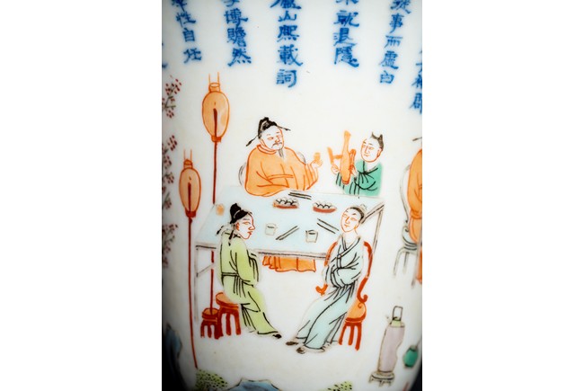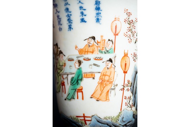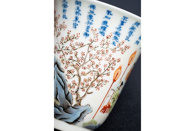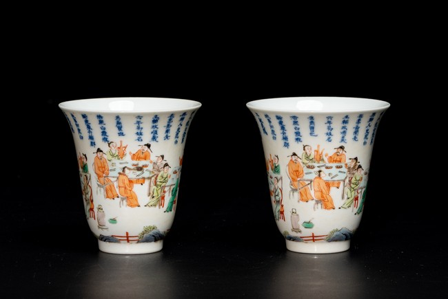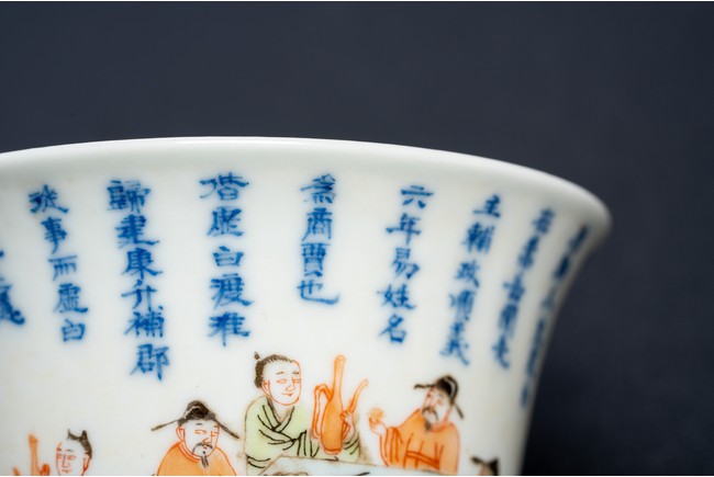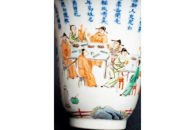 Chinese. Of curving beaker form,the steep,gently flaring sides sweeping to an everted rim and supported on straight foot,the body decorated with a scene of officials and scholars having a dinner,all below poetic inscription in underglaze blue,the base with mark.