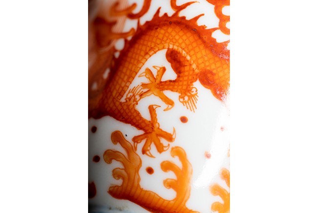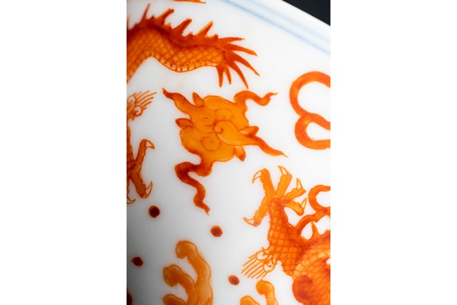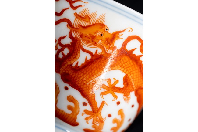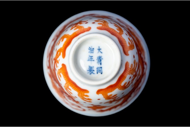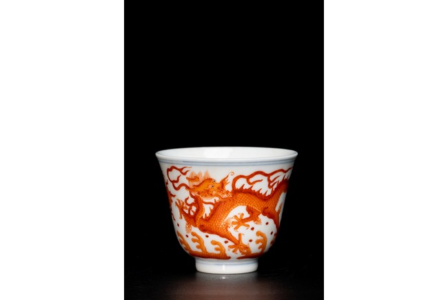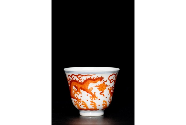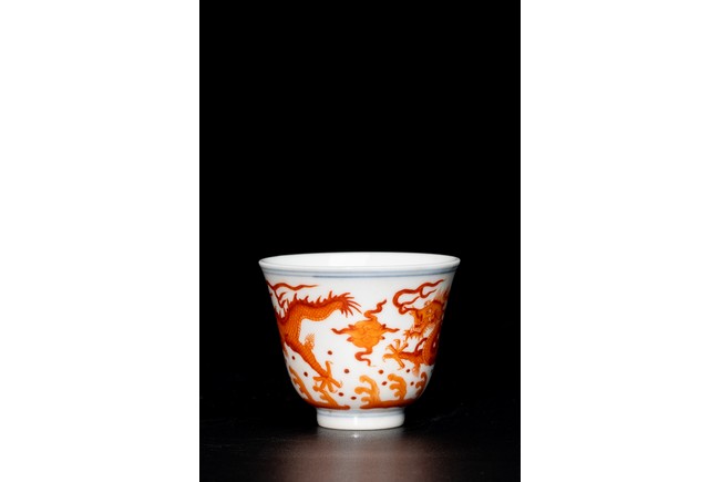 The exterior of the cup enamelled in red with dragons amidst flame,the base inscribed with a reign mark.