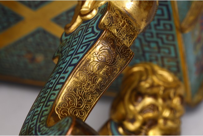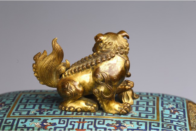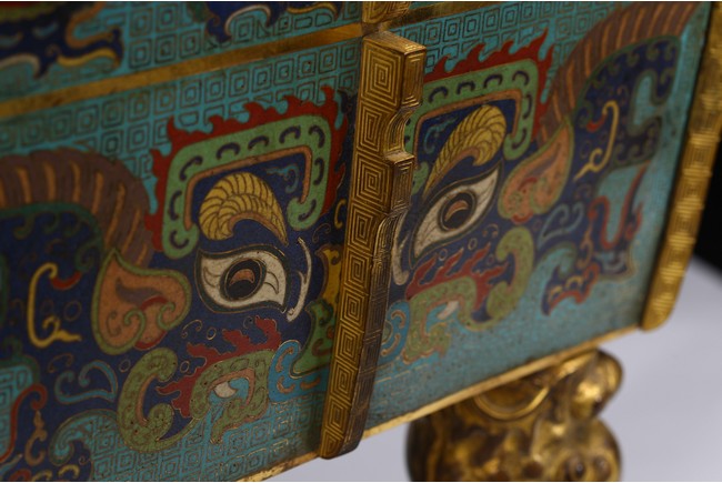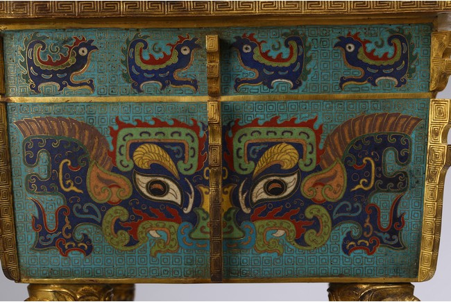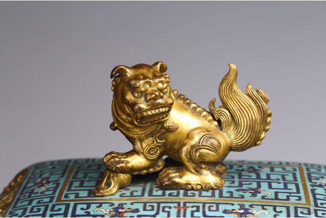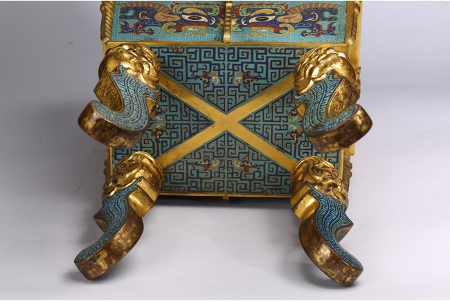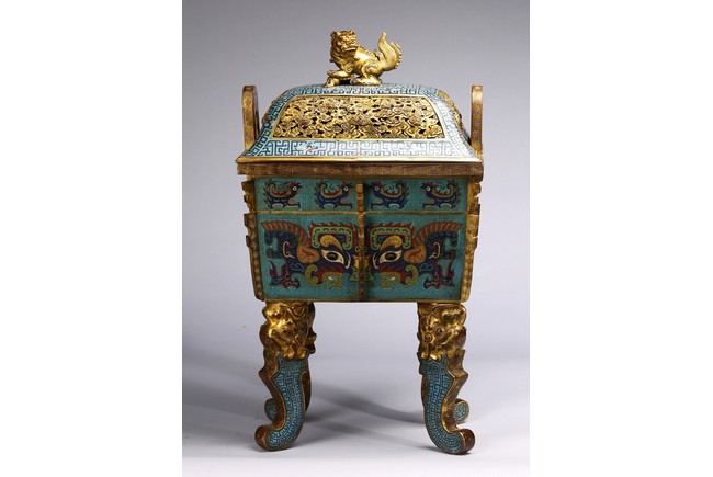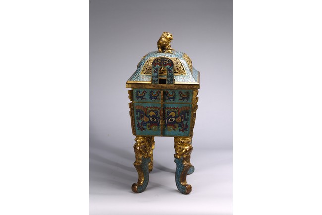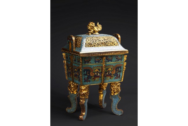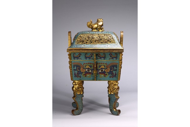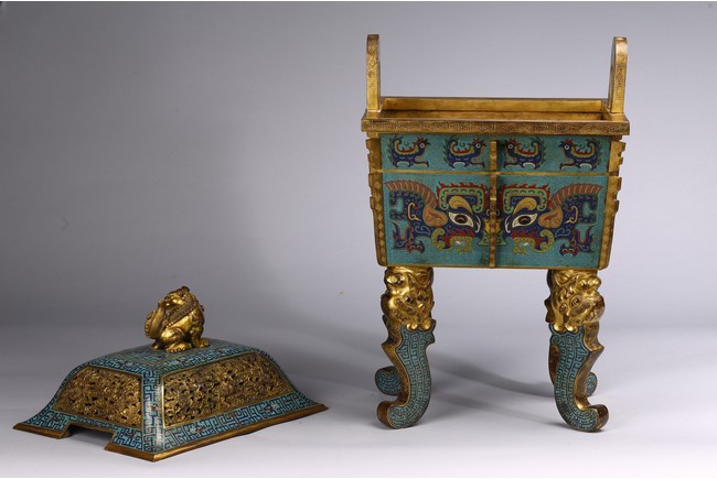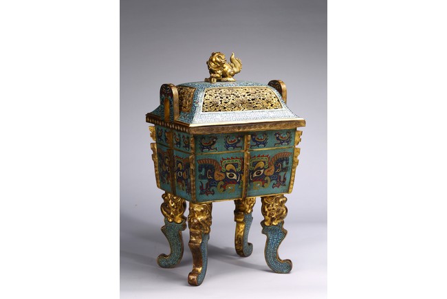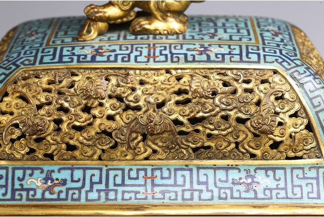 The tapering rectangular censer has twin upright handles and is decorated to each side with raised flanges separating a taotie mask below a band of archaistic kui dragons, all supported on four blade-shaped legs emerging from mythical-beast terminals. The reticulated gilt-metal cover is decorated with pierced foliage and enamelled with angular scrolls and is surmounted by a finial in the shape of a Buddhist lion. Qing Dynasty Qianlong period.
