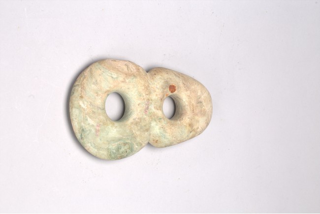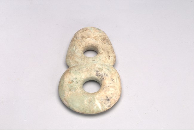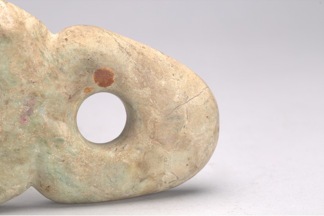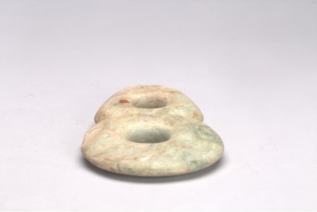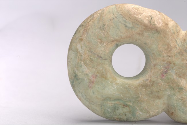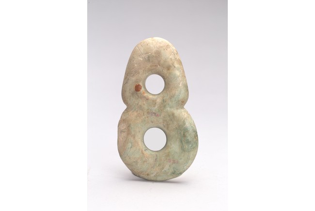The ornament pierced with two perforations of increasing sizes with the outline corresponding in form,the stone calcified to various degrees. Hongshan Culture,Neolithic period or later.