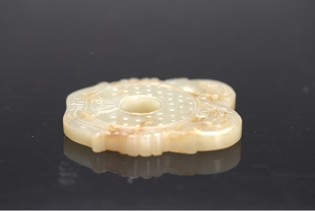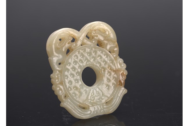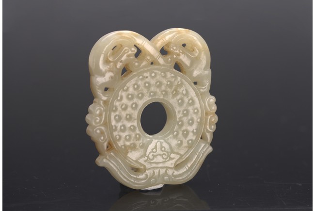 The disc carved with pair of sinuous chi dragons with tails crossed to the top,the disc carved with raised bosses on both sides,flanked by two ruyi heads on each side,above a stylized mythical beast head as the base. Qing Dynasty period.