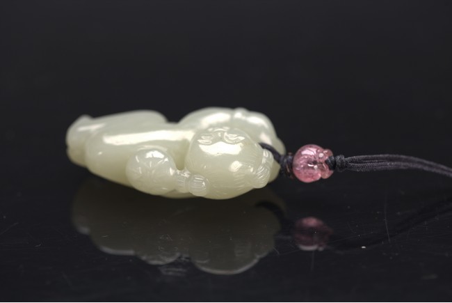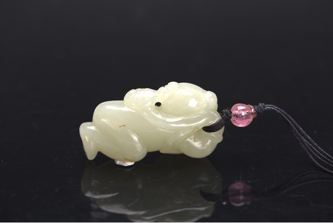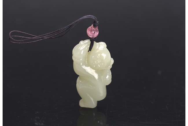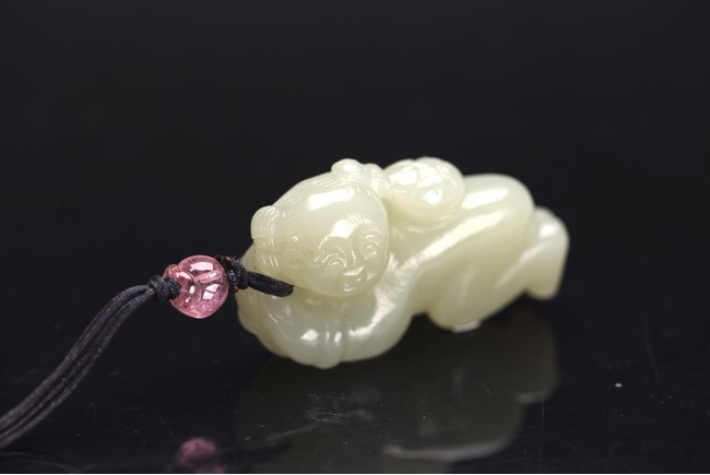 The stone is carved in the round depicting a crouching boy with a jovial expression holding a spray of lotus bud in both hands. The semi-translucent material is of an even white tone. Qing Dynasty period.