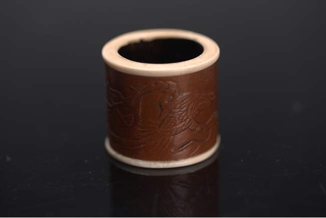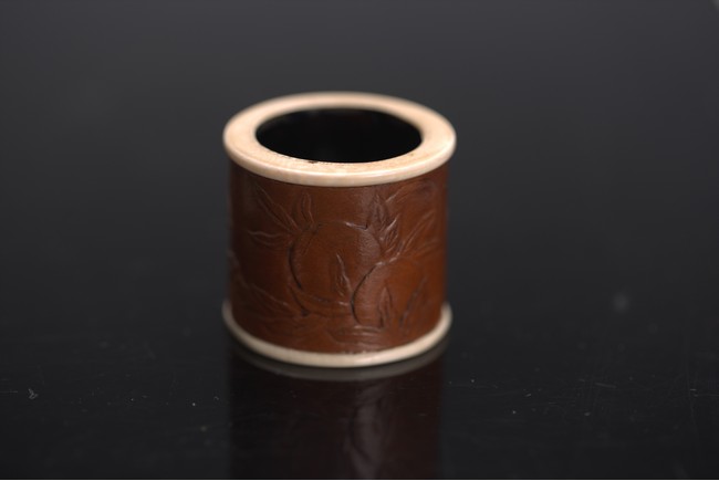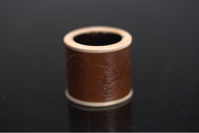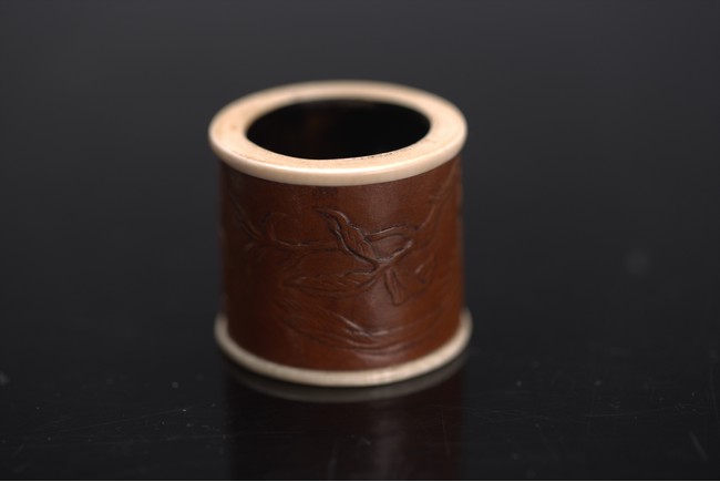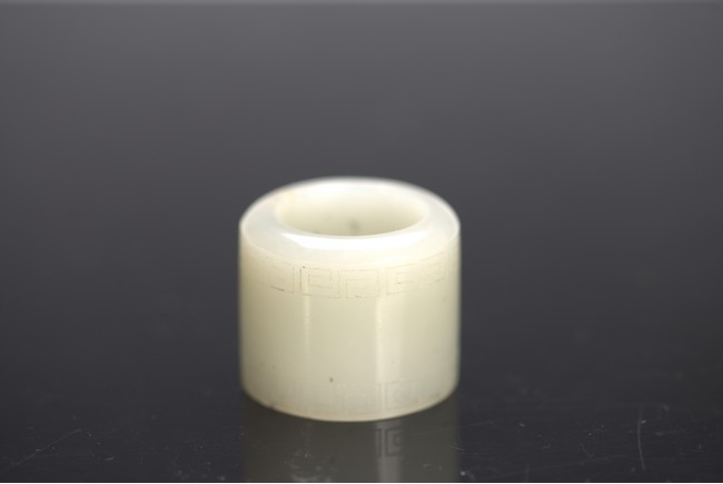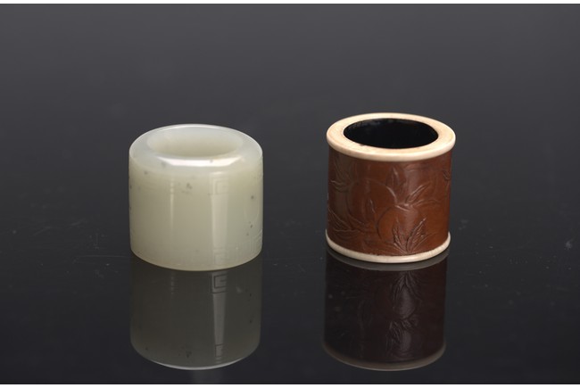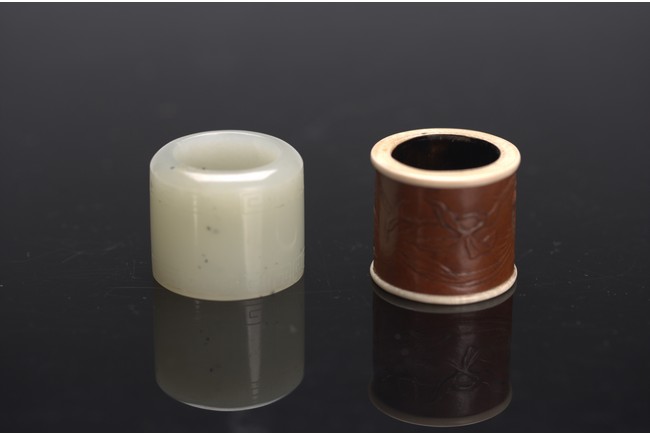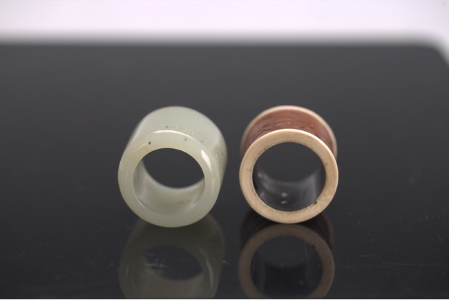 Consisted of a white jade archer's ring with key-fret bands; and a gourd archer's ring carved in shallow relief with bird perching on peach tree. Qing Dynasty period.