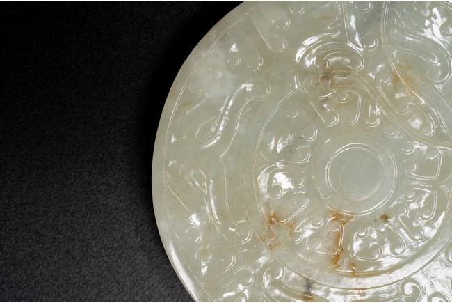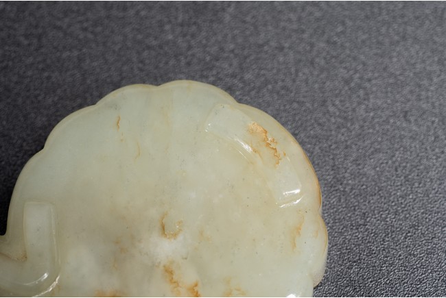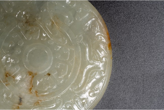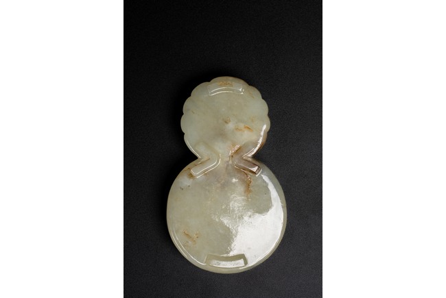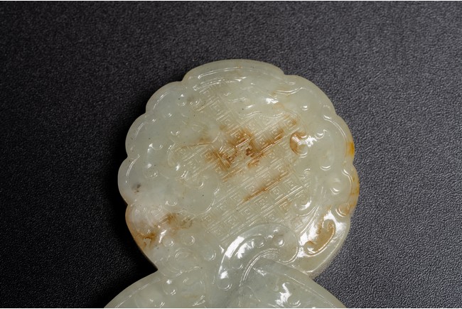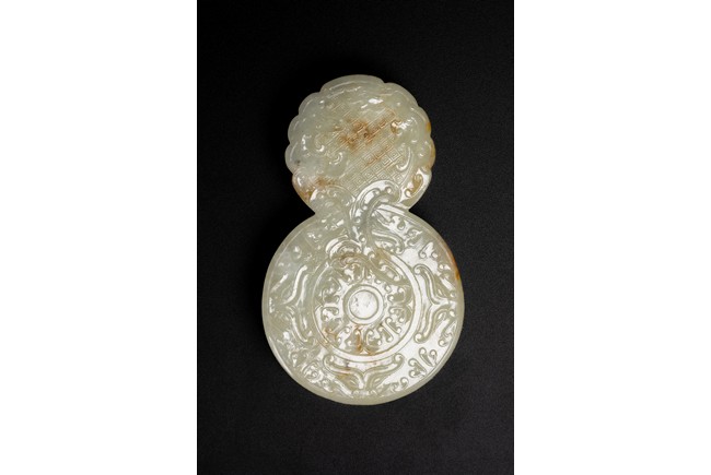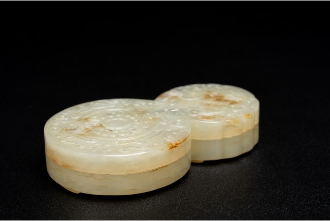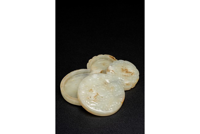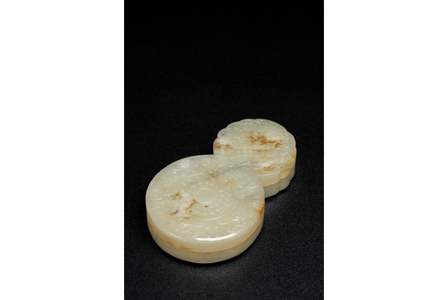 Of double gourd form,the box carved in shallow relief with archaistic kui dragon decorations over bi disc and key-fret ground,the stone is of celadon tone with russet areas.