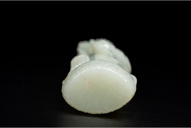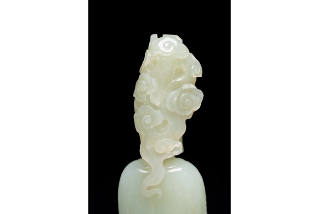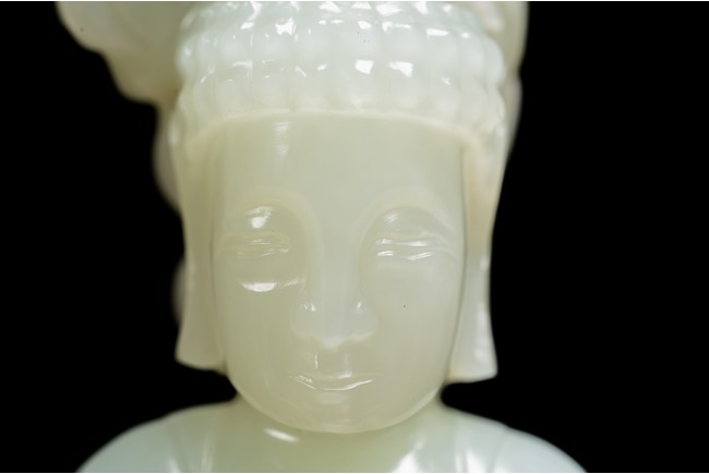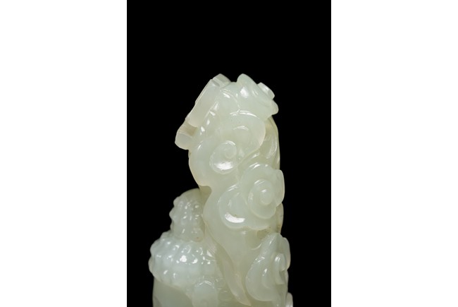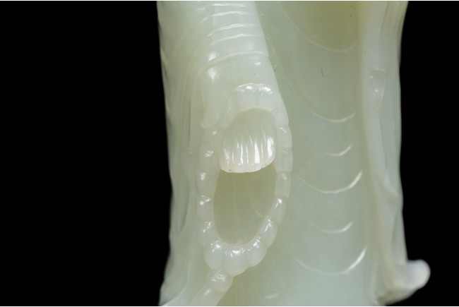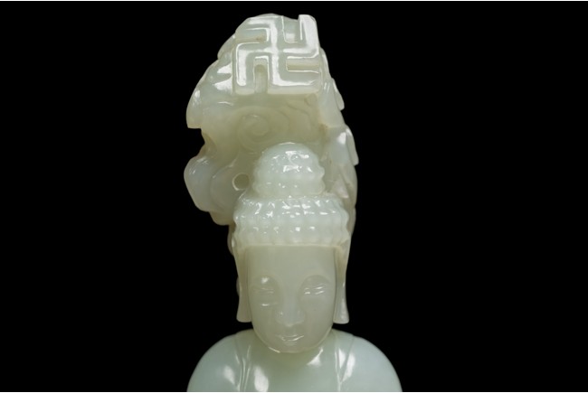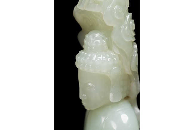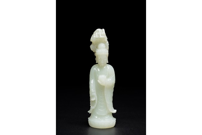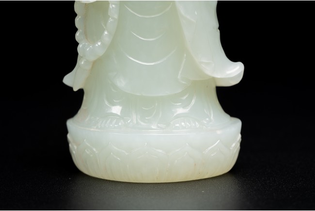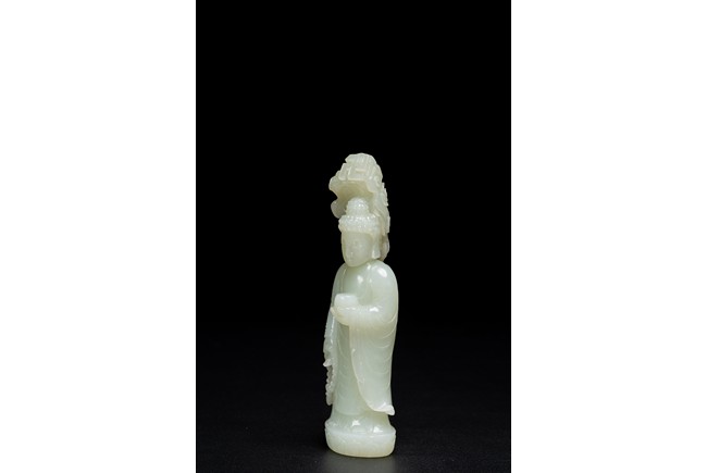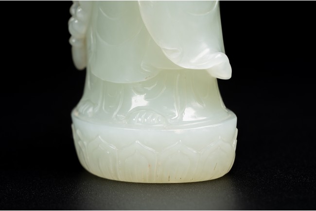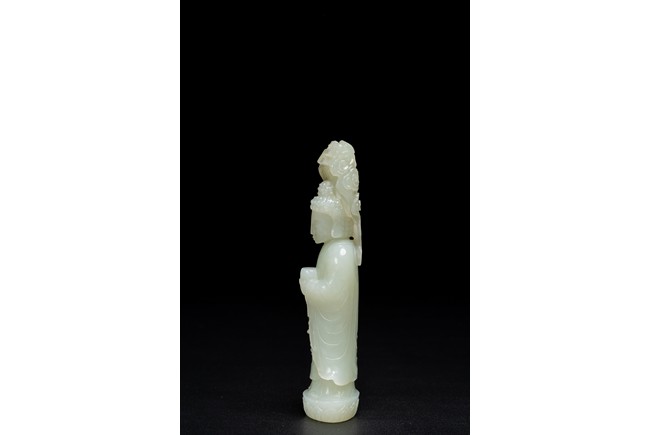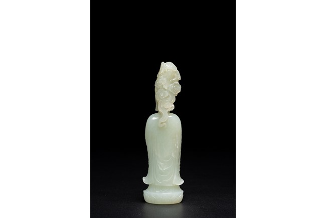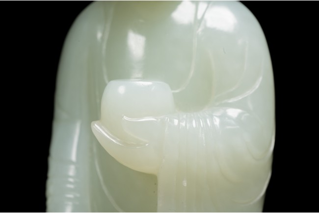 The figure of white tone carved with voluminous robes hanging in folds,left hand holding rosary beads and right holding holding alms bowl carved with clouds issuing from back of his head,the top carved with a buddhist symbol,the stone is of well polished white tone. Qing Dynasty period.