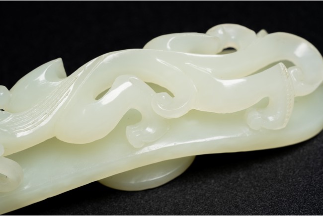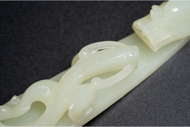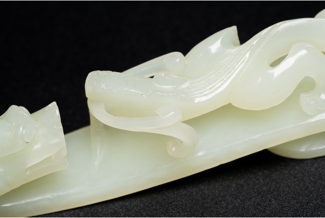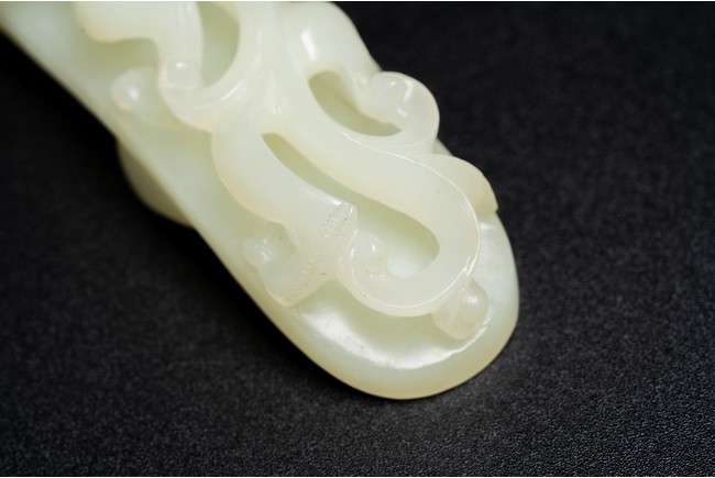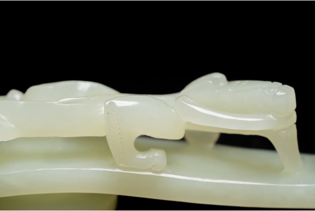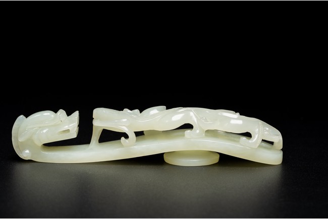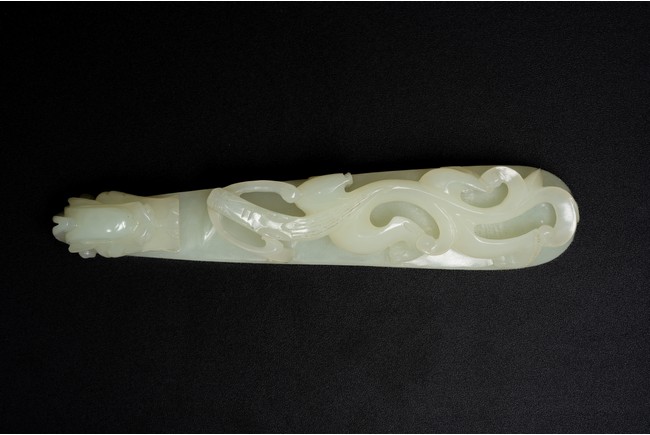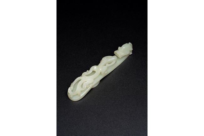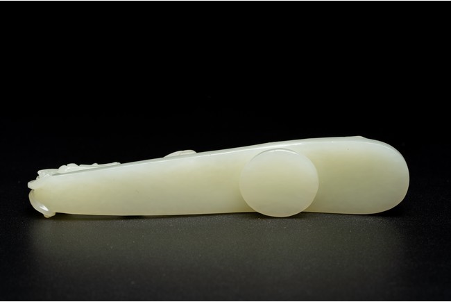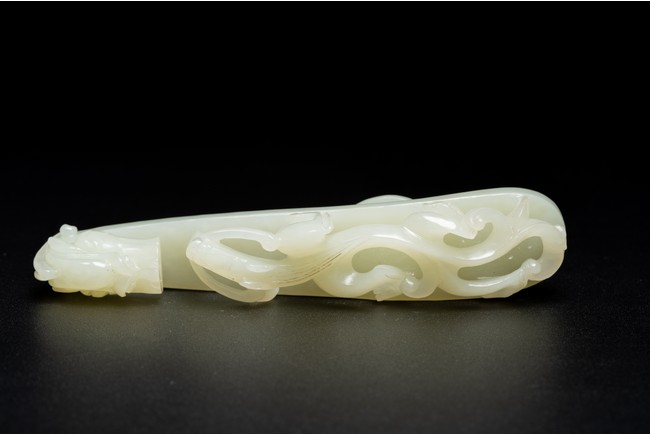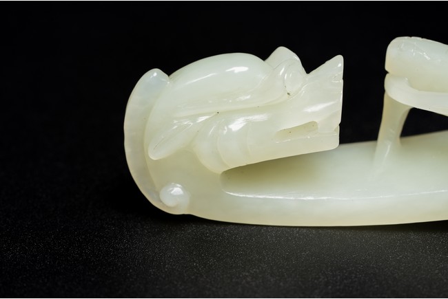The top is well carved in openwork and undercut with a chilong crawling towards the dragon-head hook. The reverse has a circular button and is undecorated. The stone is of an even white tone with soft polish. Qing Dynasty period.
