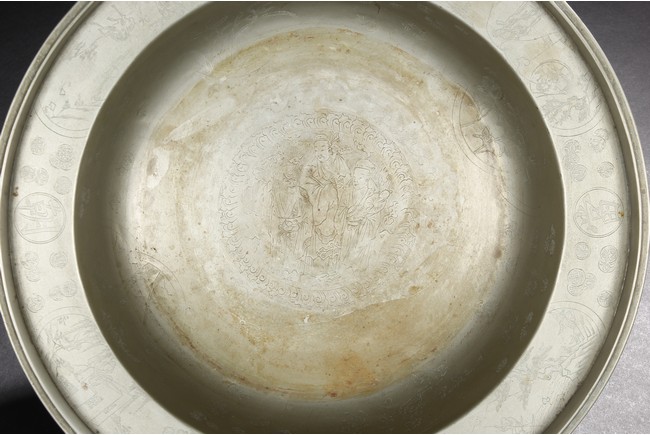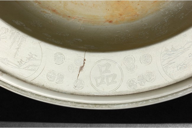 The interior finely incised with fu lu shou in a roundel,the mouth rim further decorated with story scenes and four roundels enclosing the four character Yi Pin Dang Chao,the underside base inscribed with inscriptions. Qing Dynasty period.