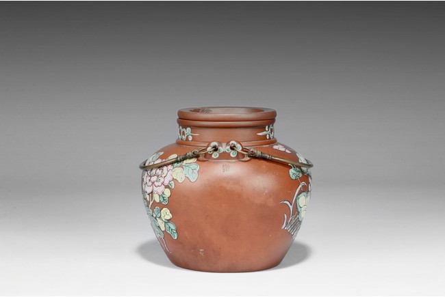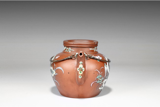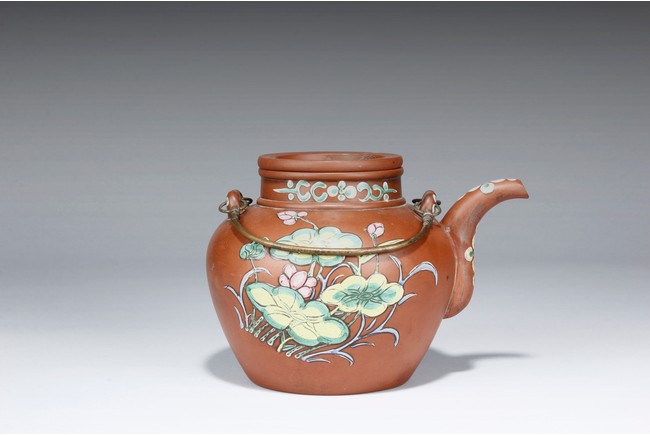 Of bulbous form,the teapot shaped similar to a jar,with arching metal handle,curved and long spout,and body decorated with phoenix,flowers,and lotus design,the lid caved in without finial. Bottom with two character “Yu Feng” mark. The teapot was made during the Republic period,when this type of teapot design was popular amongst civilians.