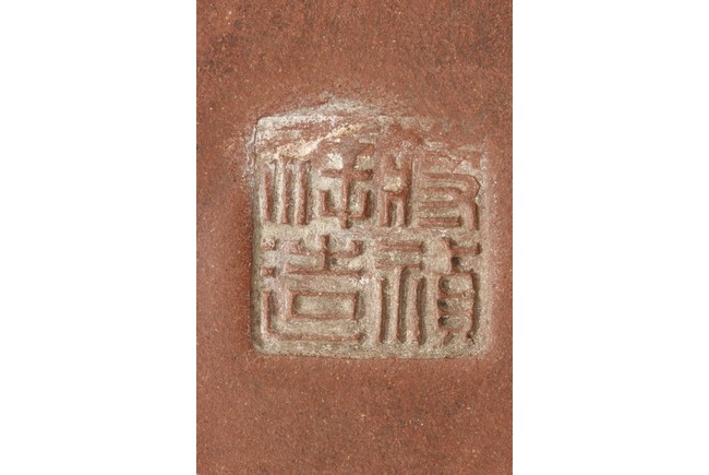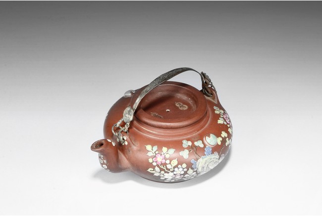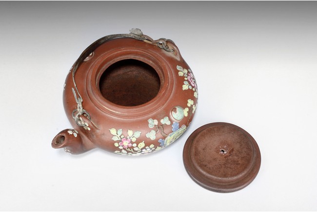 Of compressed globular form,the teapot's exterior decorated with colorful plum trees,flowers,and viewing rocks,the arched double metal handle extends over the top of teapot,the thick spout raises upwards,the lid has a bowl-like caved-in design witho