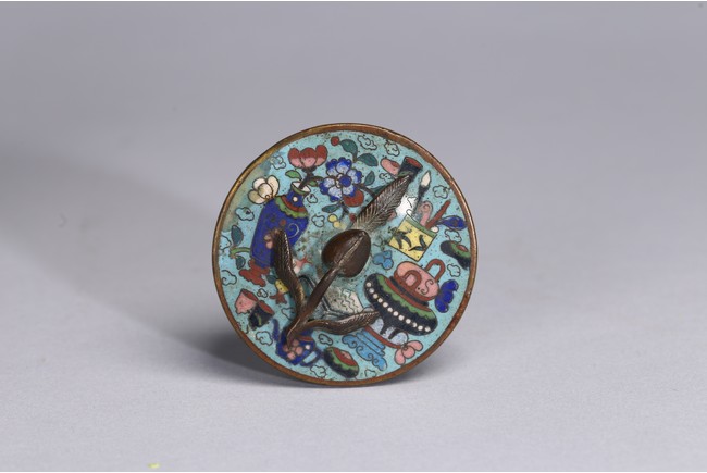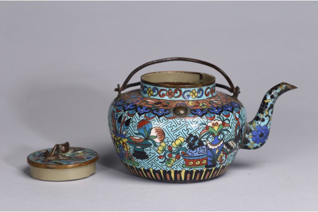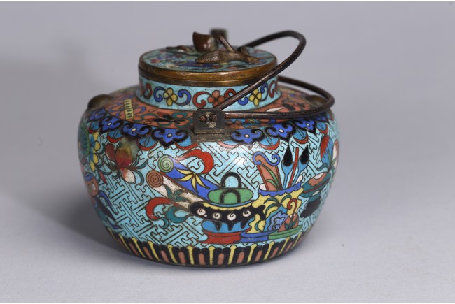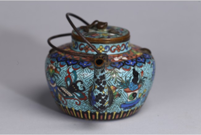 The teapot exterior enamelled in cloisonne with scholar objects. Republic period.