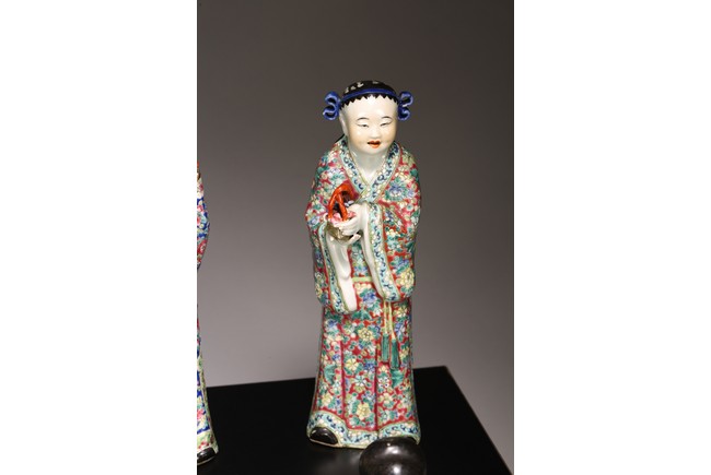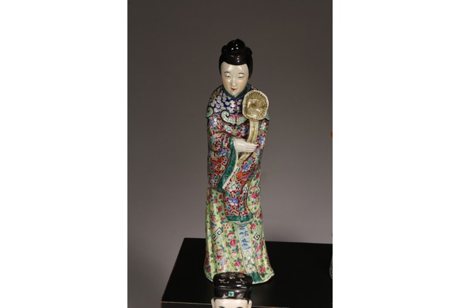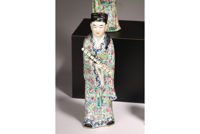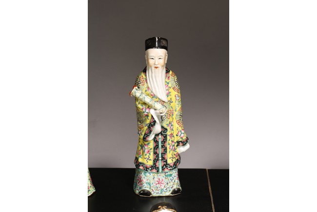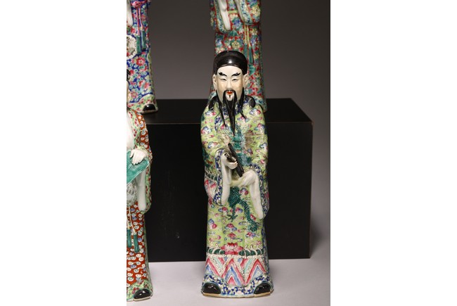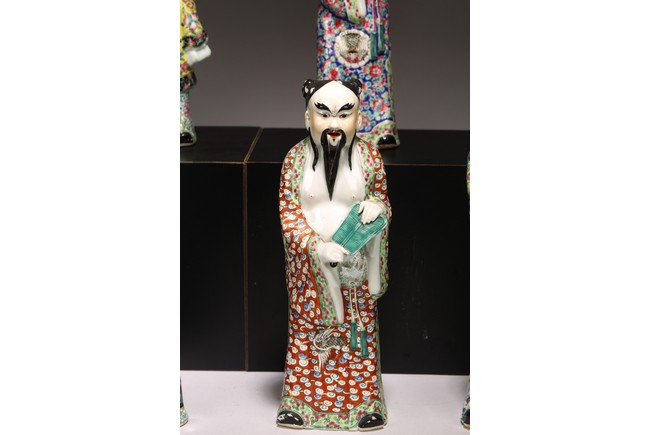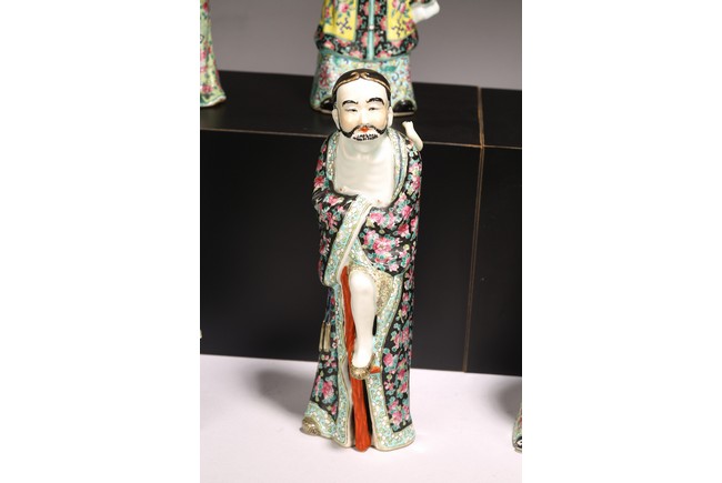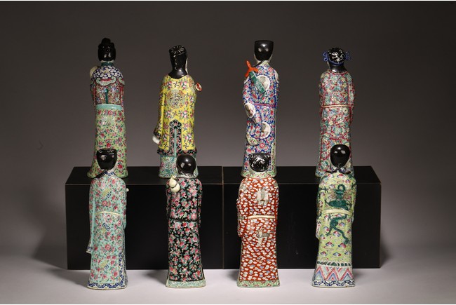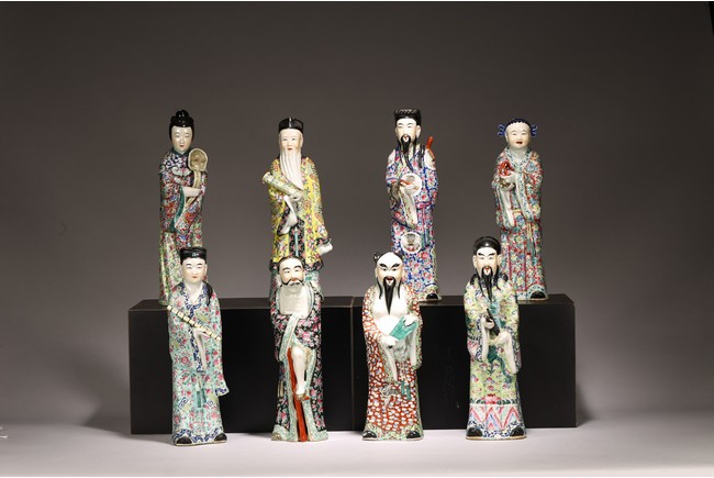 Chinese. Comprising of eight ceramic immortal figures from the Chinese Taoist mythology,namely He Xiangu,Cao Guojiu,Li Tieguai,Lan Caihe,Lü Dongbin,Han Xiangzi,Zhang Guolao,Zhongli Quan,each modelled standing wearing brightly enamelled robes and holding their attribute. Qing Dynasty period.