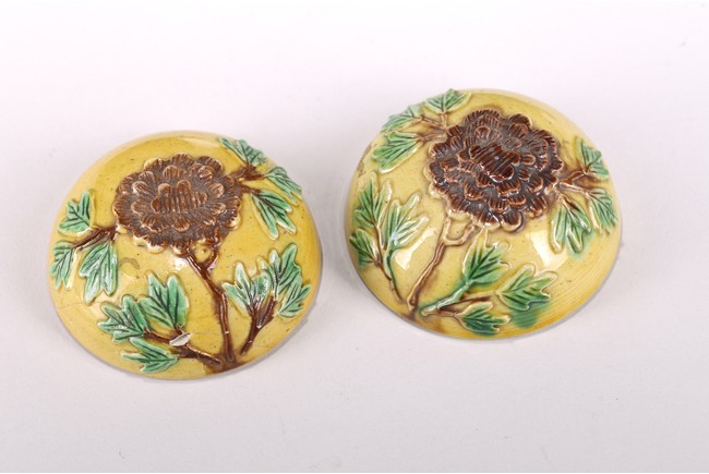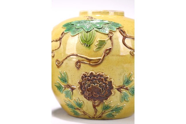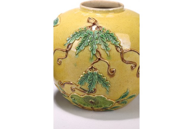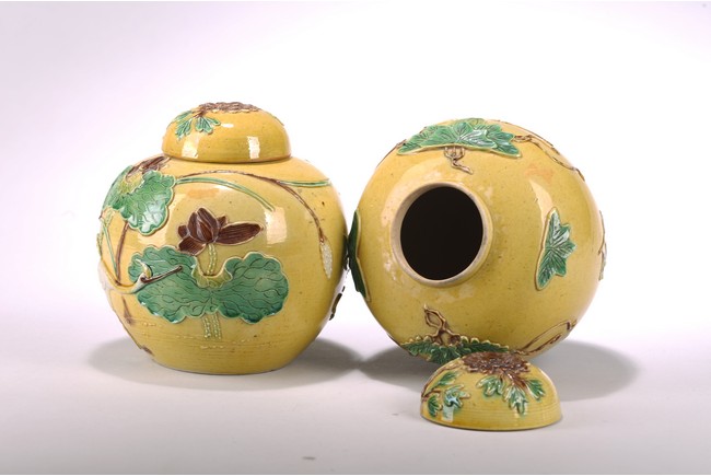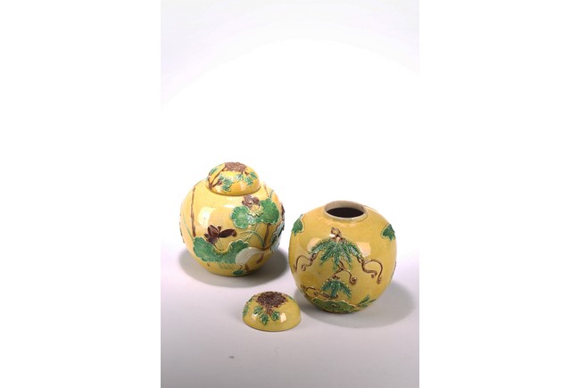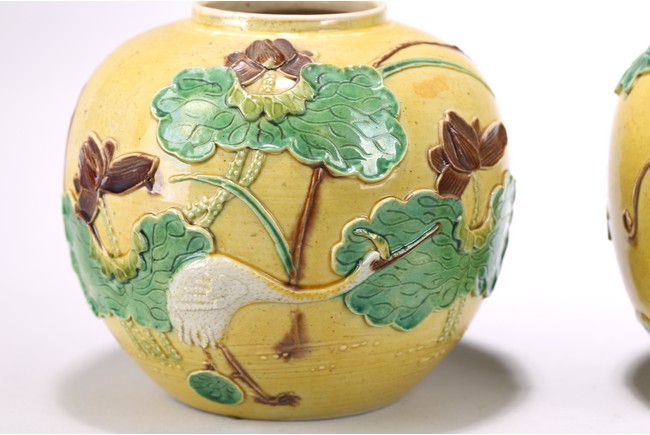 Of globular form,moulded in high relief around the exterior with cranes wading through a lotus pond,the other with flowers and vine,glazed in white,green and aubergine tones reserved on a yellow ground. 19th century,Qing Dynasty period.