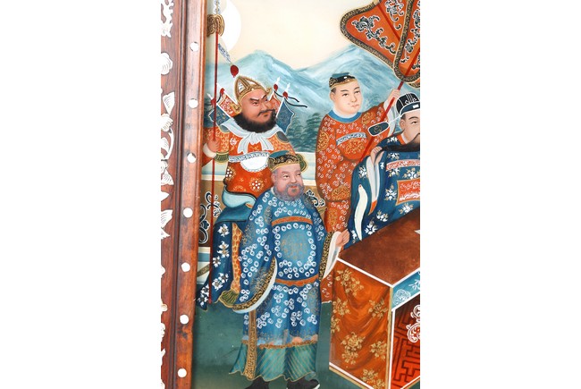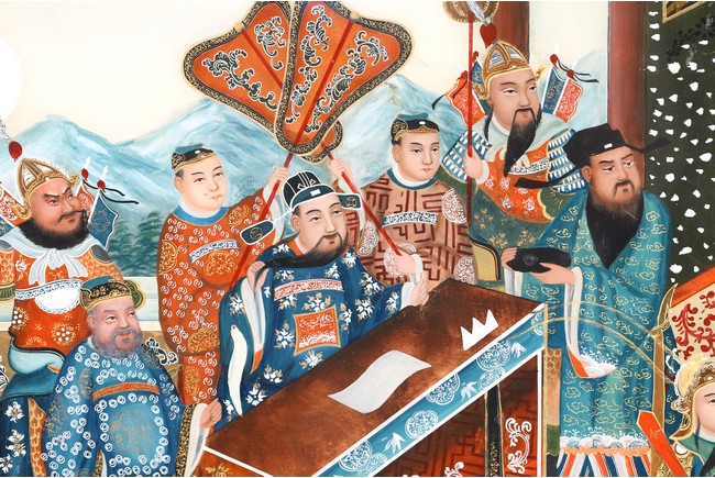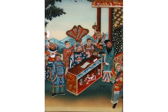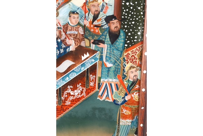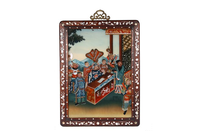 The mirror panel depicting Chinese court scene within hardwood frame inlaid with mother of pearl. 19th century,Qing Dynasty period.