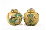 A PAIR OF YELLOW GLAZE LOTUS POND JARS AND COVERS