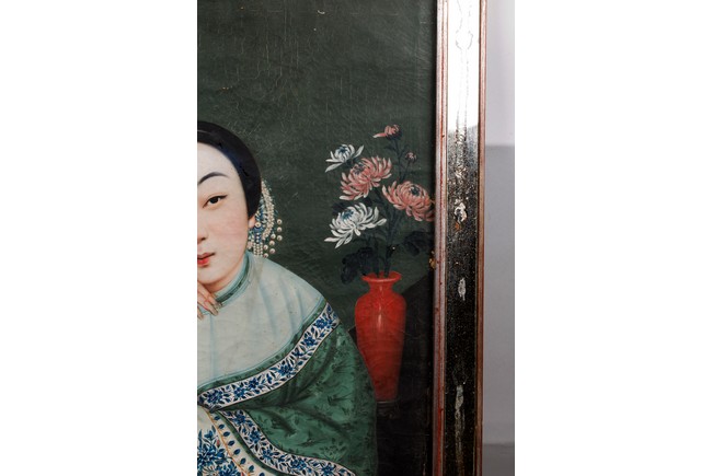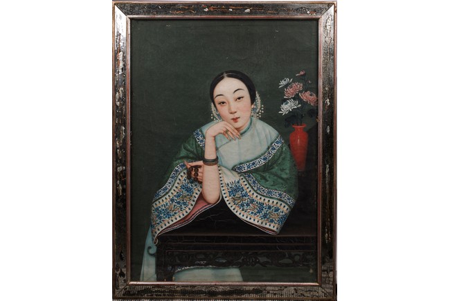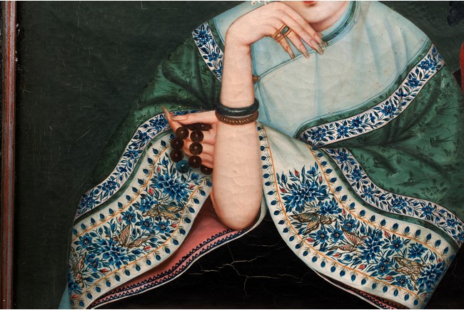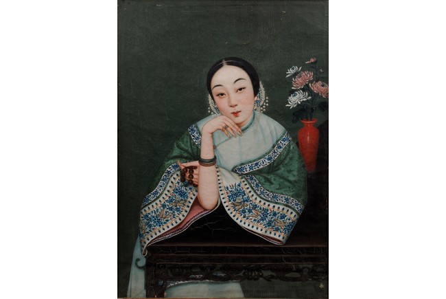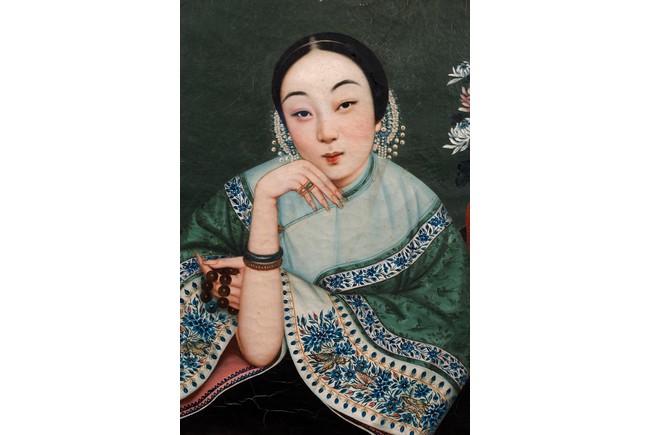 Oil on canvas, depicting the lady seated, wearing pale blue and green embroidered robe, one hand supporting chin, the other holding a rosary bead bracelet, adorned with jewellery on her wrists, fingers, ears and hair, the face with porcelain like complexion and eyes with direct gaze and slight smile. Qing Dynasty period.
