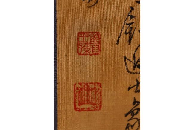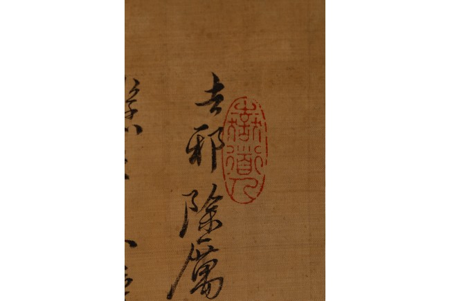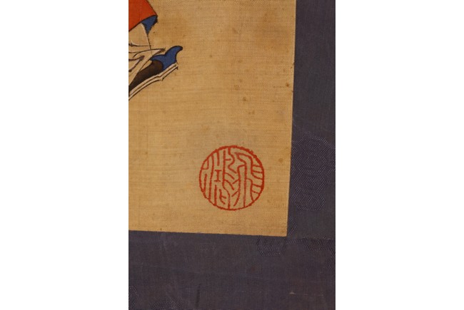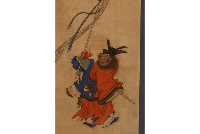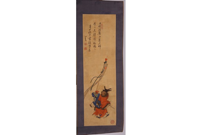 Color and ink on silk. Zhong Kui the demon Queller. Framed. Inscribed and signed Xin Yu, with four seal marks of the artist.