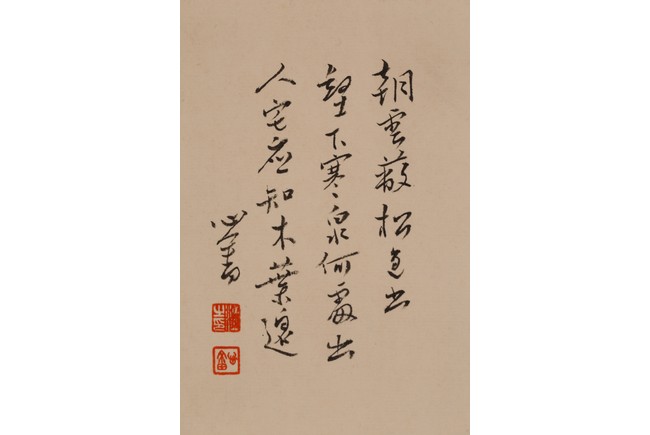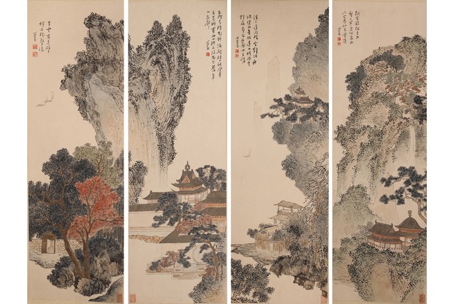 款識: 1. 溪上遙聞精舍鐘, 泊舟微徑度深松。青山霽後雲猶在, 畫出西南四五峰。心畬。2.朝雲蔽松色,出壑下寒泉。何處出人宅,应知木葉退 3. 生雲有危壁,横石聴驚湍 4.玉階青瑣散斜陽,破壁秋風草木黄。抵有西山终不改,尚分蒼翠入空廊 鈐印: 溥儒之印,心畬, 舊王孫。 鑑藏印:雙照樓後人之藏 Provenance: Private collection, Los Angeles