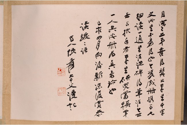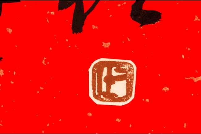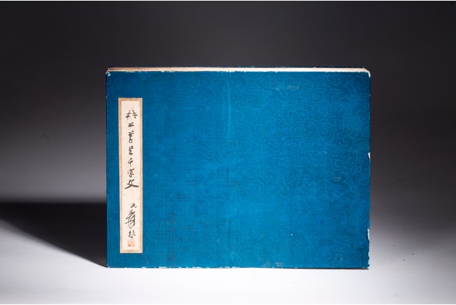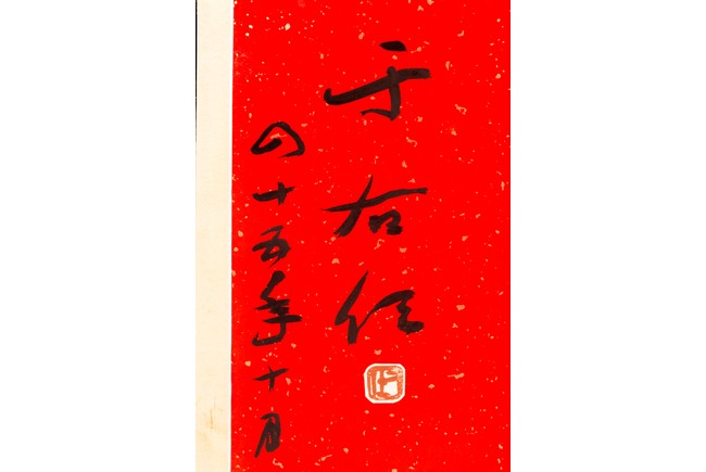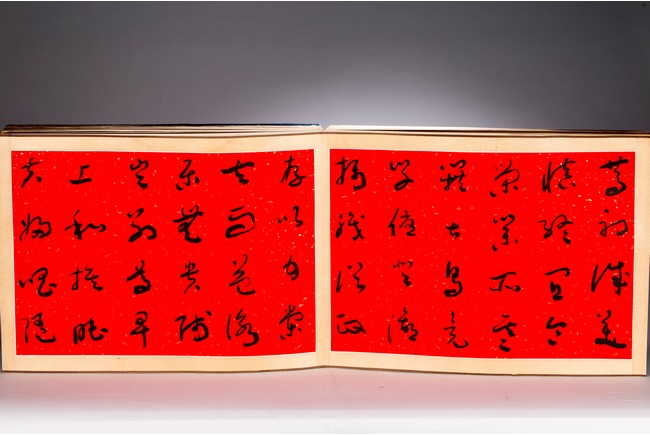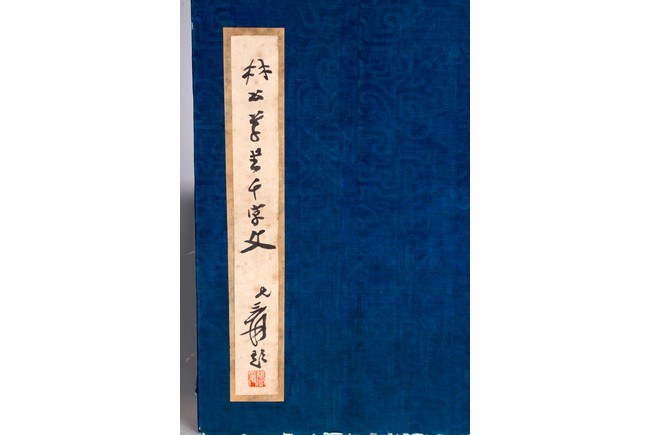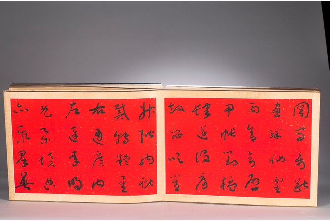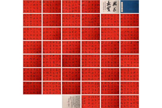 Ink on gold cinnabar paper, thousand character classic in cursive script calligraphy, album, forty-five leaves, signed Yu Youren, dated to October 1956, with one seal mark of the artist. Titleslip, frontispiece, and colophon by Zhang Daqian seal marks.
