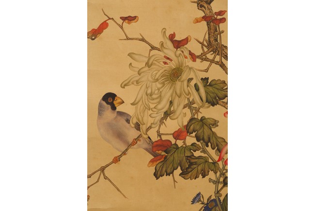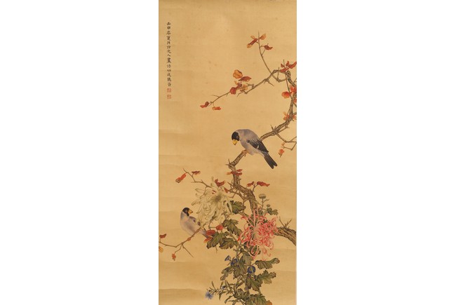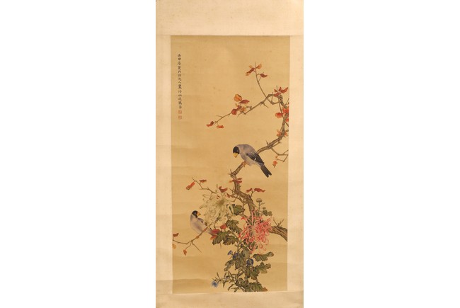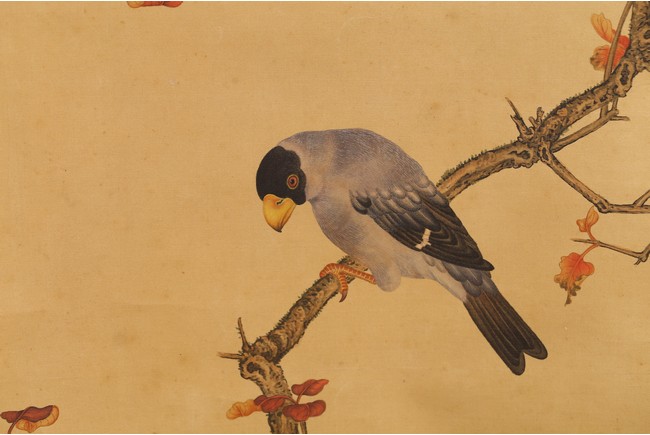 Color and ink on silk. Bird and Flowers. Mounted on paper. Inscribed and signed, with two seal marks of the artist.