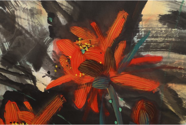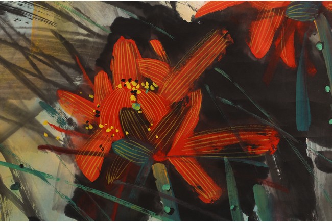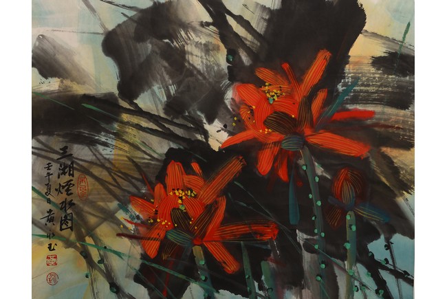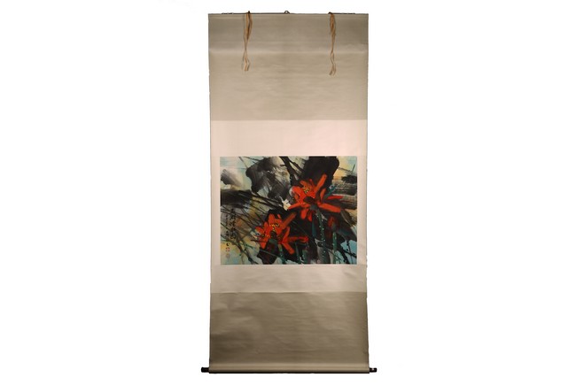 Color and ink on paper. Hanging scroll. Lotus. Inscribed and signed Hong Yongyu, dated to summer of 2002, with three seal marks of the artist.