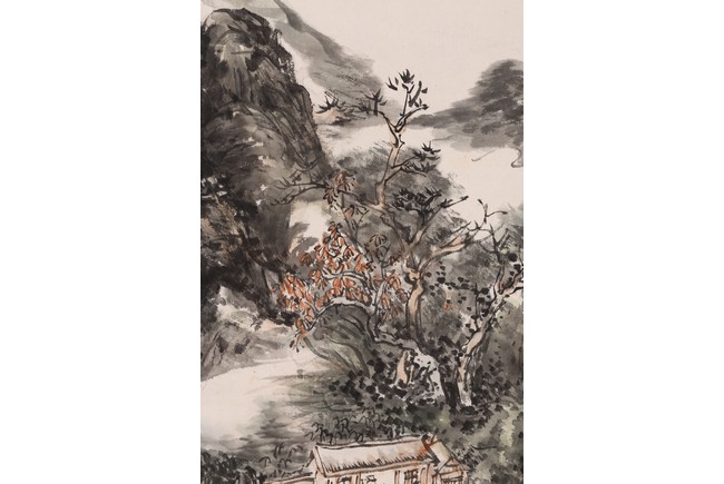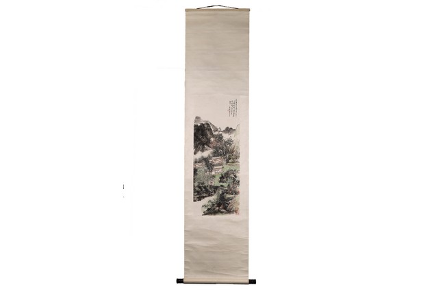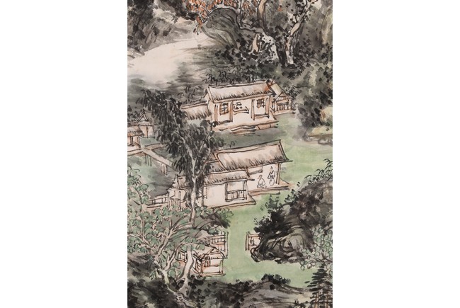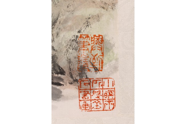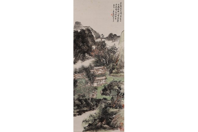 Color and ink on paper. Blue and Green Mountain Landscape. Inscribed and signed Binhong, dated to year of 1949, with three seal marks of the artist.