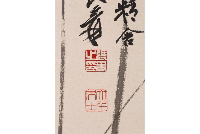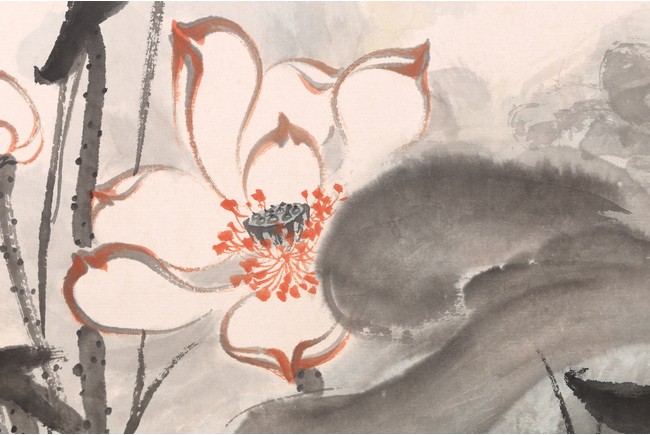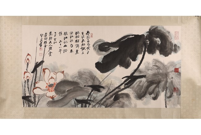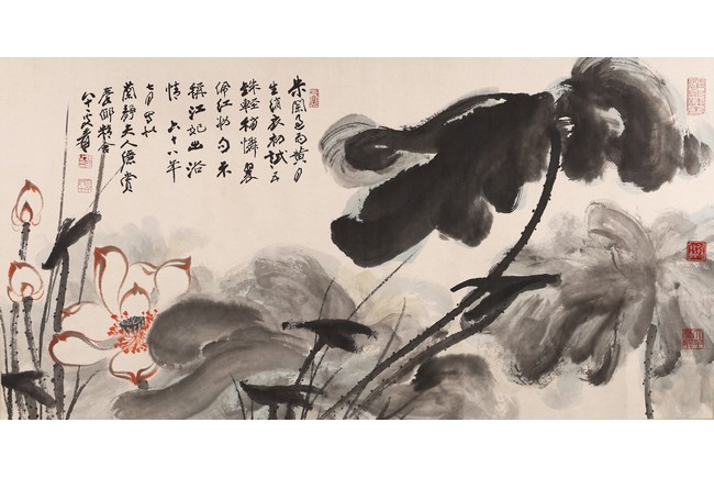 Ink on paper. Framed. Lotus. Inscribed and signed Yuan, with six seal marks of the artist.