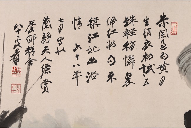 款識: 朱蘭過雨黃月生,綃衣初試五銖輕。稍嫌翠佩紅妝句,不稱江妃出浴情。六十八年七月寫蘭靜夫人憶賞,摩耶精舍,八十一叟爰。鈐印:大千居士,張爰之印,摩耶精舍,大千毫髮,已亥已巳戊寅辛酉,已未。 Provenance: Property from an important private collection, San Francisco, collected prior to 1990s.