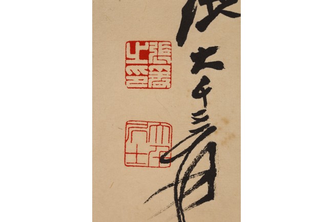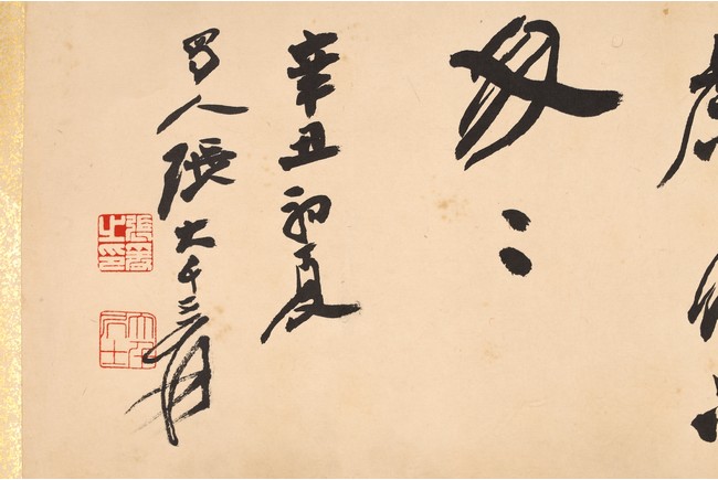 款識: 饒丹浪說駐春客,何似銜孟發醉紅,棋局未終柯已爛,神仙嵗月亦匆匆。辛丑初夏蜀人張大千爰。鈐印:大千居士,張爰之印