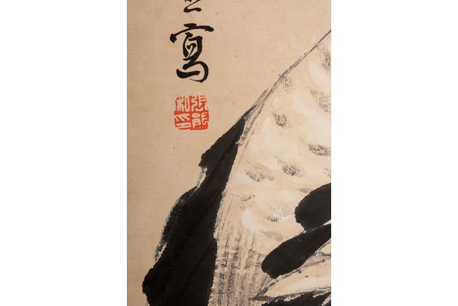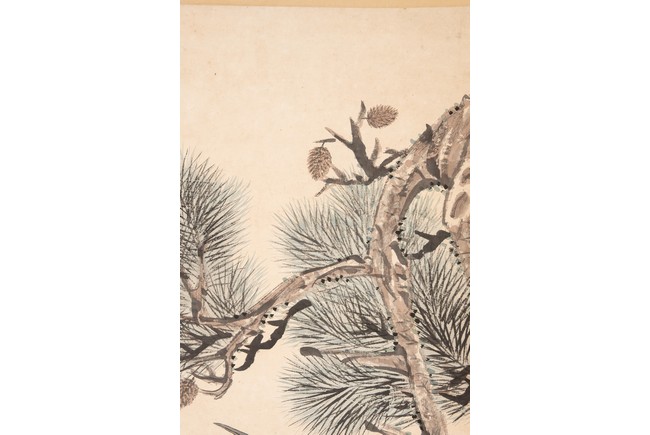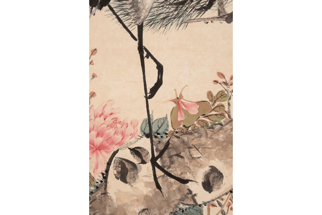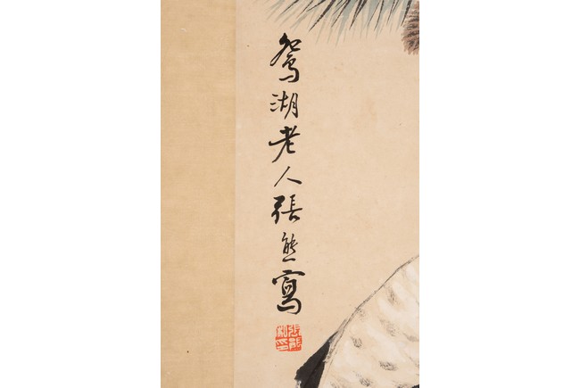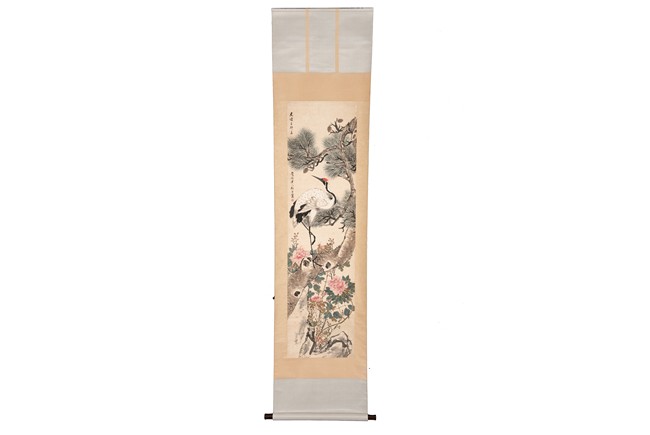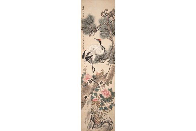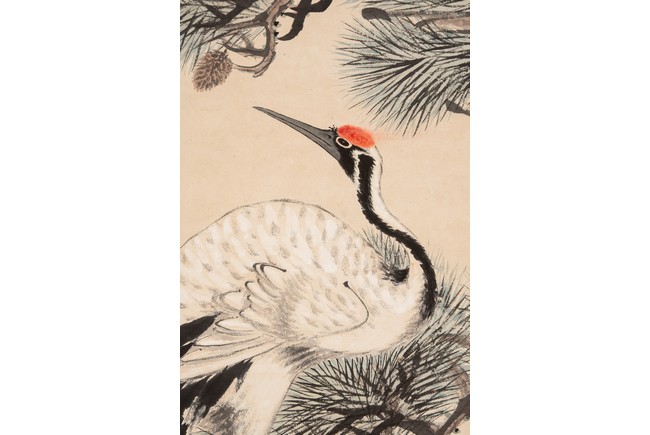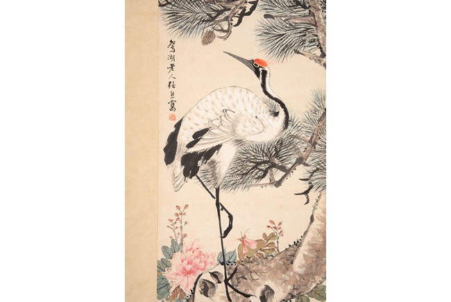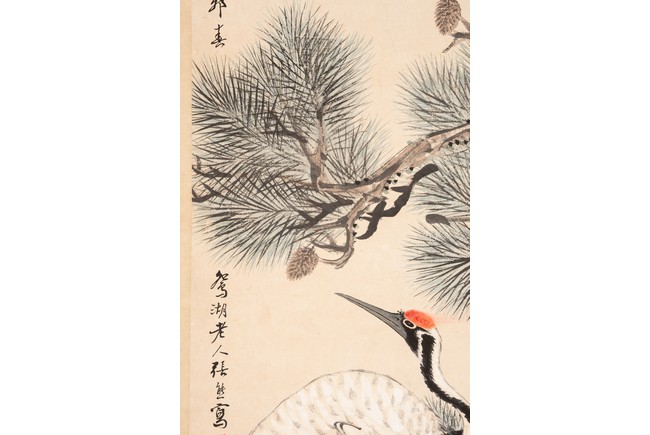 Color and ink on paper. Crane and Pines. Inscribed and signed Zhang Xiong, with onseal mark of the artist. Hanging scroll.