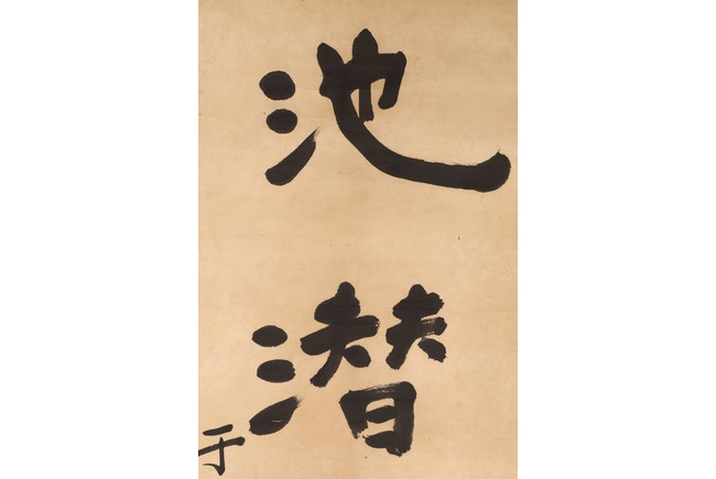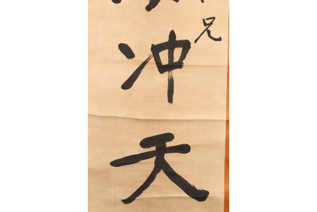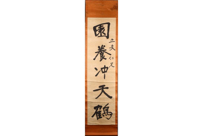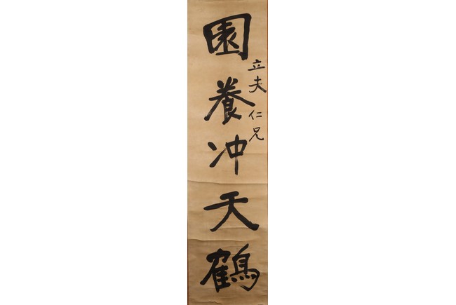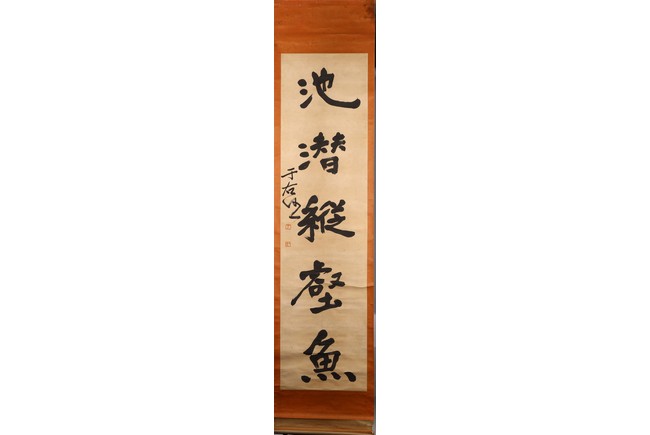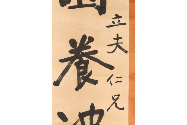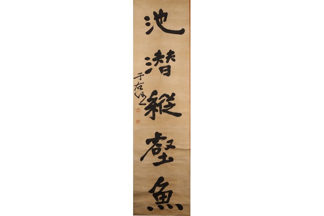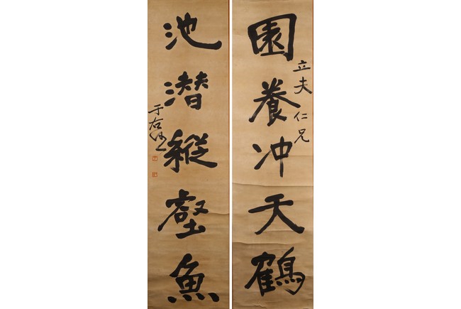 題識: 立夫仁兄。于右任。釋文: 園養冲天鶴,池潛縱壑魚 鈐印:于,右任 註: 上款人立夫應為陳立夫,陳立夫(1900~2001),名祖燕,字立夫,浙江吳興(今湖州)人。陳果夫之弟。早年留學哈佛大學,與其兄同任國民黨要職。去台灣後,任“總統府”資政等職。晚年為孔孟學會會長。著有《唯生論》、《四書道貫》等。