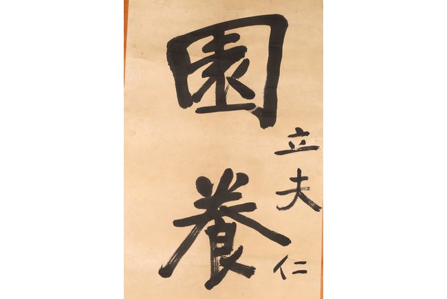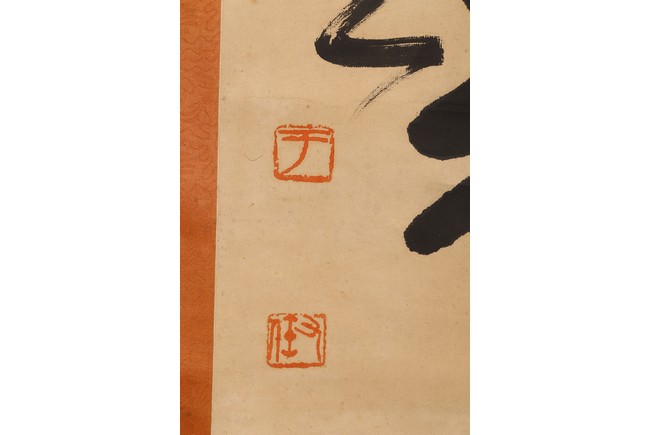 Ink on paper. Five character regular script calligraphy. Dedicated Li Fu, signed Yu Youren. Hanging scroll