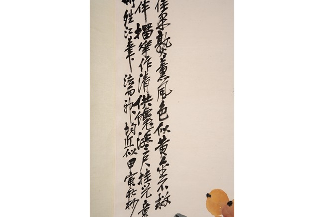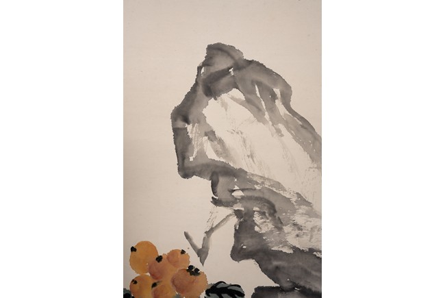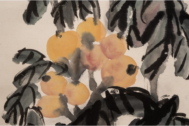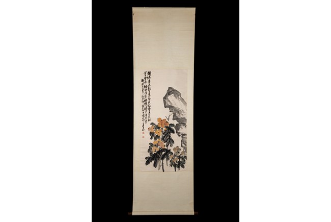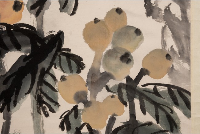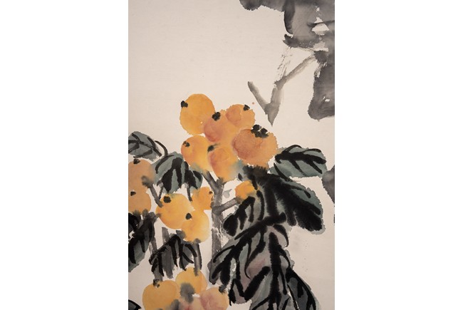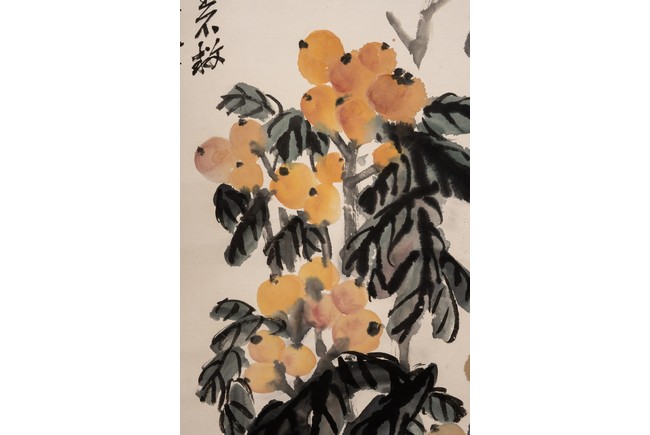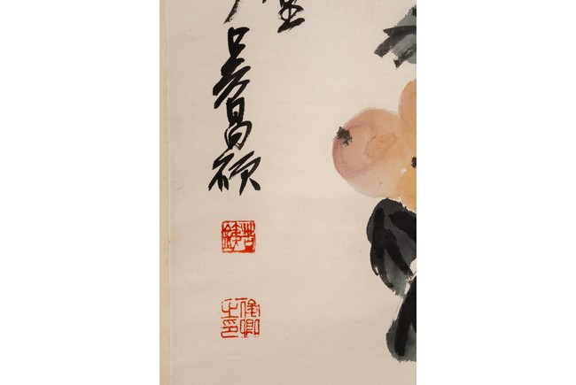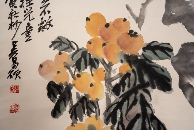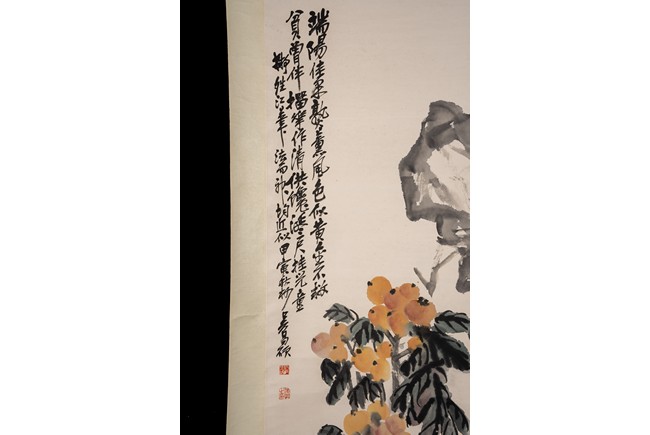 Color and ink on paper. Loquat and Rocks. Hanging scroll. Inscribed and signed Wu Changshuo with two seal marks of the artist.