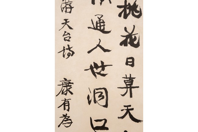 款識: 胡麻無飯只桃花。日莫天台石已斜,桃源已不通人世,洞口長封流翠露。春遊天台詩。康有為 鈴印:康有為印 維新百日出亡十六年三周大地遊遍四洲經三十一國行六十萬里 作者介紹:康有為,原名祖詒,字廣廈,號長素,又號明夷、更甡、西樵山人、遊存叟、天遊化人,廣東省廣州府南海縣丹灶蘇村人,人稱康南海,中國晚清時期重要的政治家、思想家、教育家,清末維新變法派主要發起者。