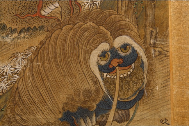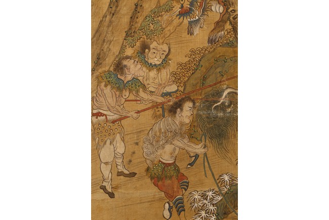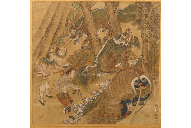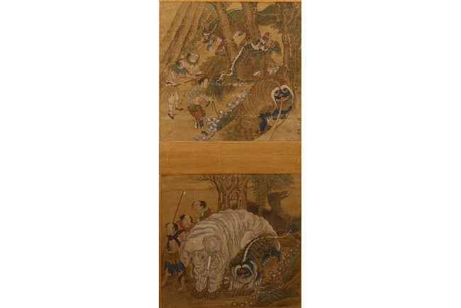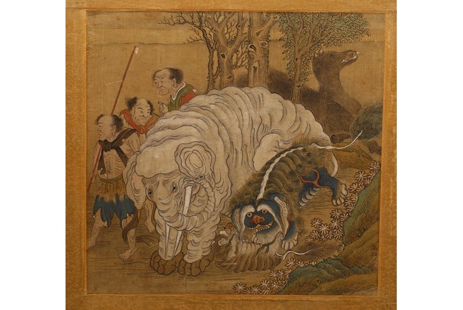 Chinese. Color and ink on silk. Elephant and Qilin. Framed. Signed Wan Jiang Ding Yunpeng. 18th or 19th century, Qing Dynasty period.
