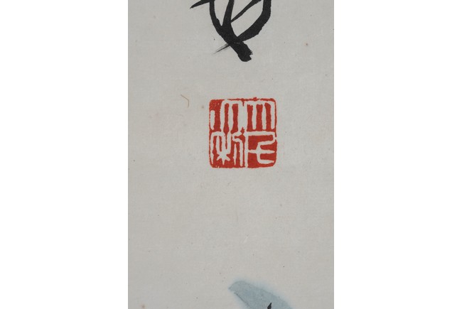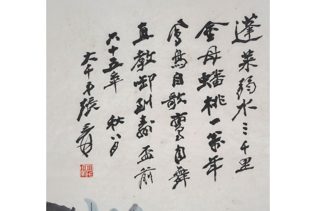 款識: 蓬萊弱水三千里,金母蟠桃一萬年。鳳鳥自歌鸞自舞,直教啣到壽盃前。六十五年秋八月,大千弟張爰。鈴印:大千大利。