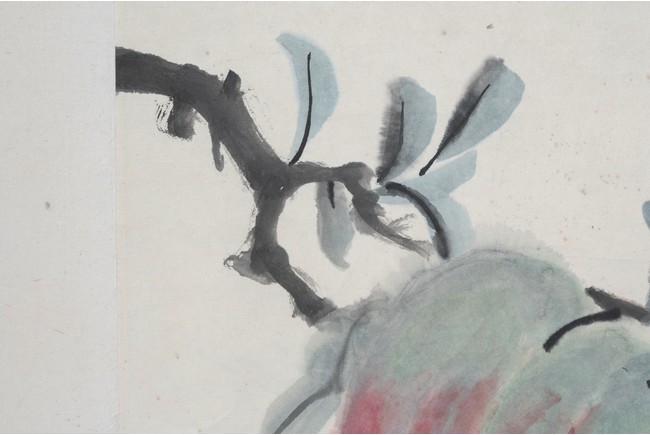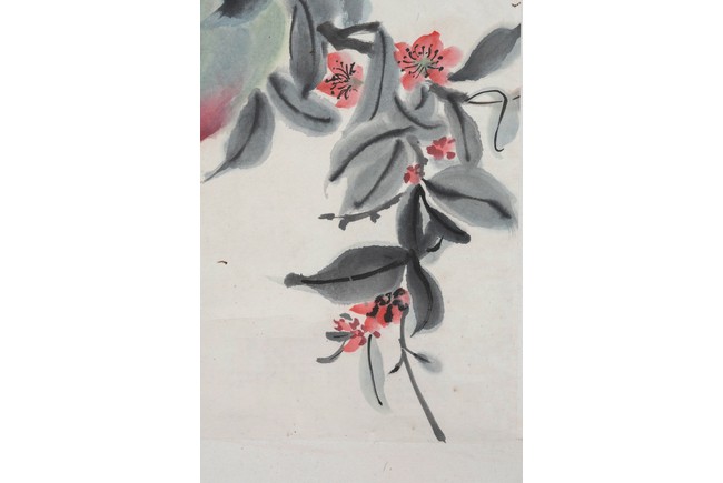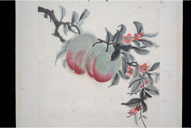 Color and ink on paper. Peaches. Hanging scroll. Inscribed and signed Zhang Yuan, with one seal mark of the artist.