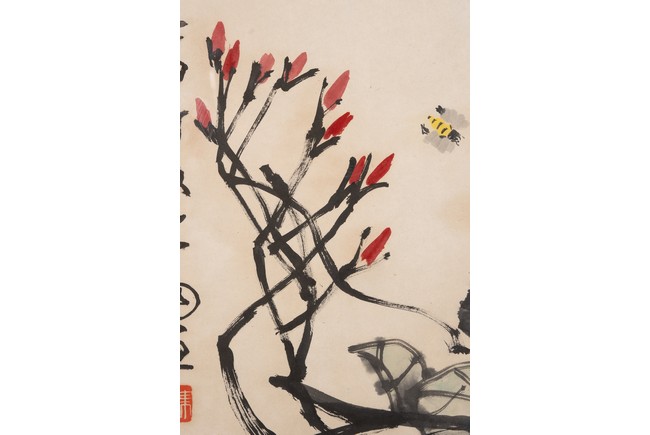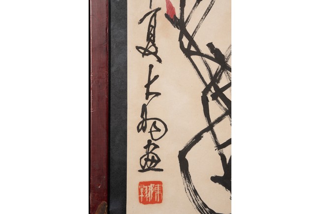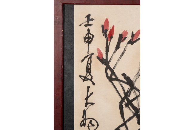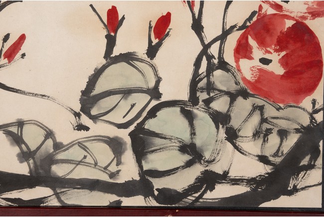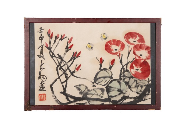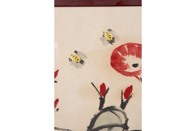 題識:壬申夏大羽畫 鈴印:陳翱 作者介紹: 陳大羽,原名陳漢卿,後其師齊白石為他改名翱,字大羽,以字行,生於廣東朝陽,中國花鳥畫畫家、書法家、篆刻家。中國美術家協會會員,中國書法家協會會員,南京藝術學院美術系名譽主任。長期從事中國畫藝術教育。以大寫意花鳥而著稱,尤擅畫雄雞,作品氣勢宏偉,多體現出欣欣向榮的氣象。