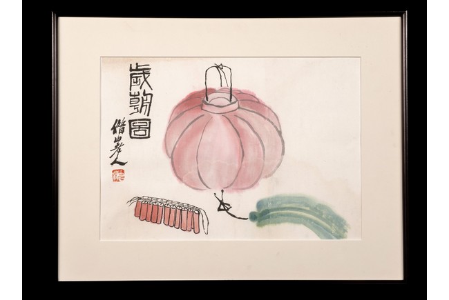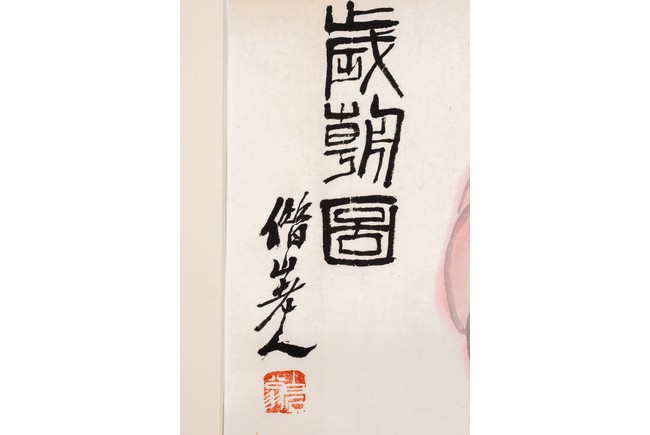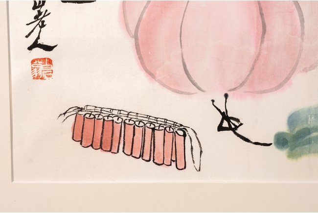 歲朝圖。偕山老人 鈴印:白石翁。 (齊白石:號白石、白石山翁、老萍、餓叟、借山吟館主者、寄萍堂上老人、三百石印富翁,曾任中央美術學院名譽教授、中國美術家協會主席等職,任北京中國畫院名譽院長。擅畫花鳥、蟲魚、山水、人物,筆墨雄渾滋潤,色彩濃艷明快,造型簡練生動,意境淳厚朴實。) Provenance: Private collection, Los Angeles