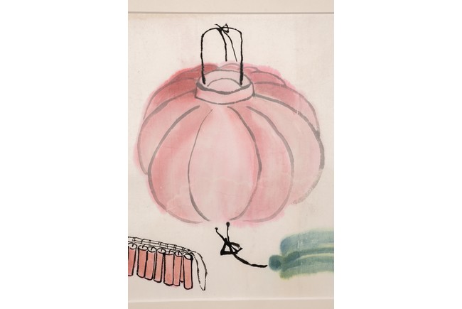 Color and ink on paper. New Year's Scene. Framed. Signed Jie Shan Lao Ren, one seal mark of the artist.