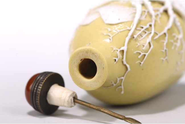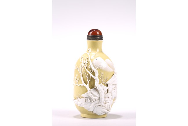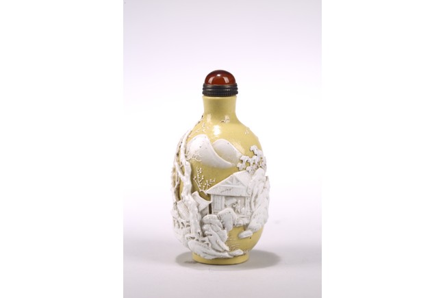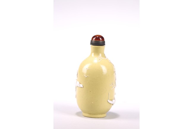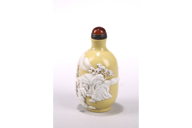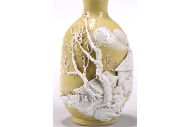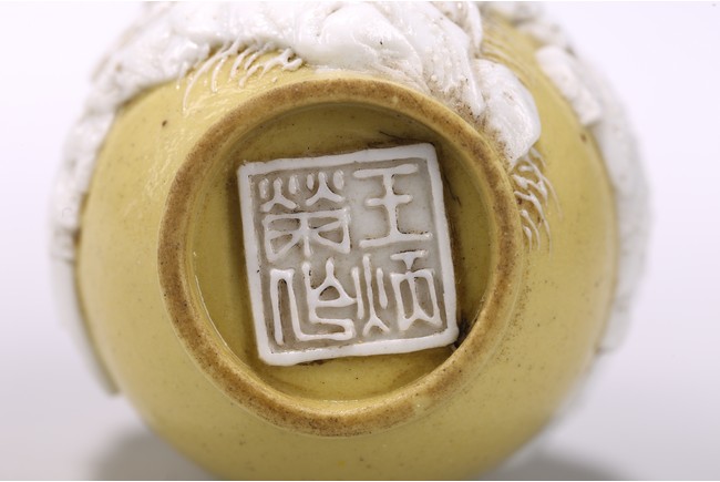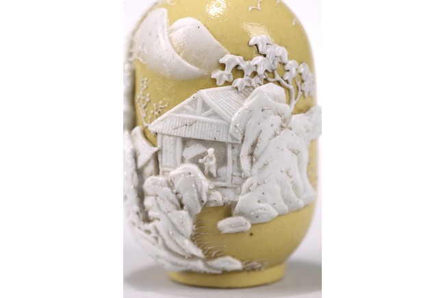 Finely decorated to the exterior in relief with riverscape village scene reserved in white, against yellow glaze body, base carved with four character mark 'Wang Bingrong Zhi'. Qing Dynasty period.