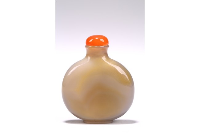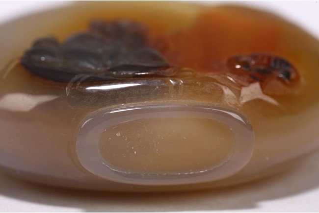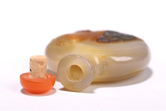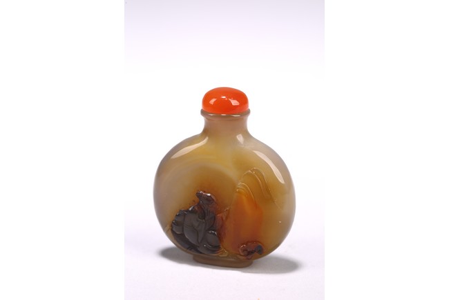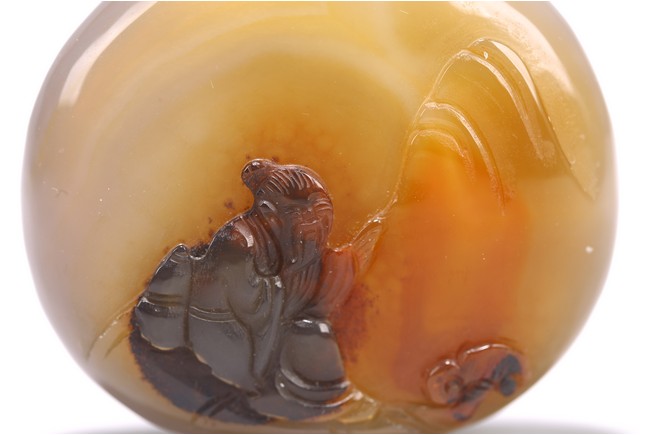 The snuff bottle carved with an elder figure using different tones of the stone in relief. 19th century, Qing Dynasty period.