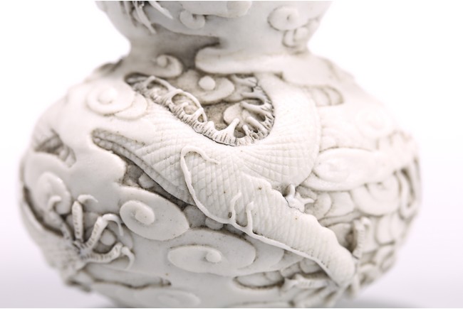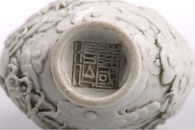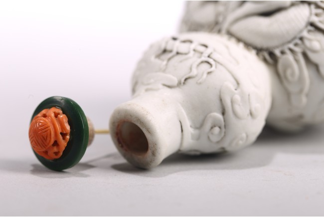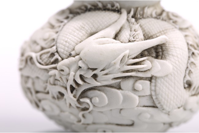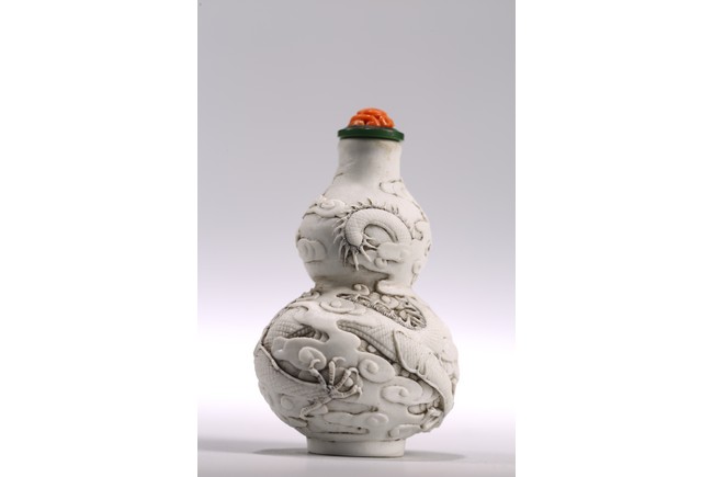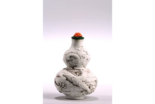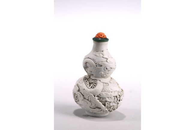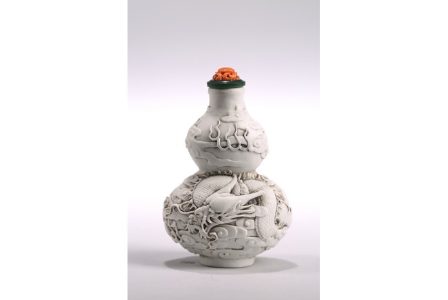This white porcelain double gourd shaped snuff bottle carved in relief with sinuous dragon amidst dense clouds, fitted with a carved coral stopper, the base inscribed with four character mark 'Chen Guo Zhi Zhi'. 19th century, Qing Dynasty period.