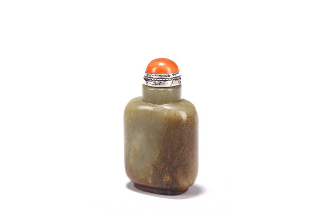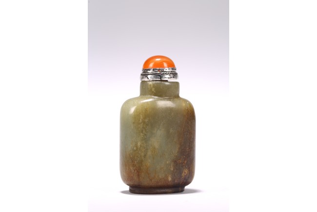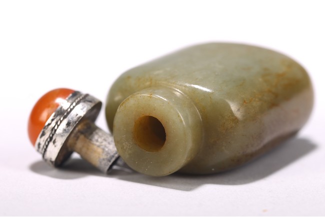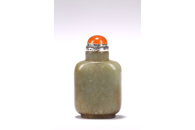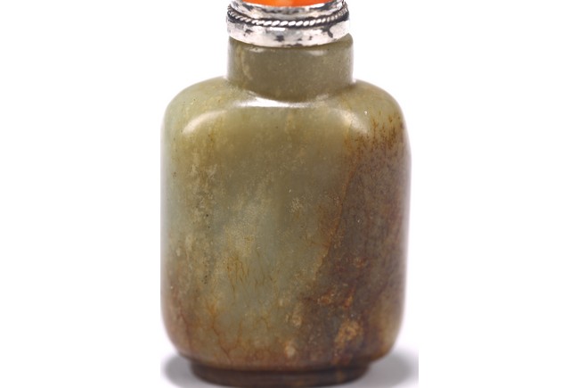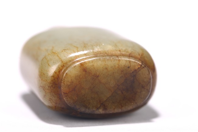 Well hollowed, of flattened rectangular form, the stone is of celadon and russet tone, fitted with stopper. Qing Dynasty period.