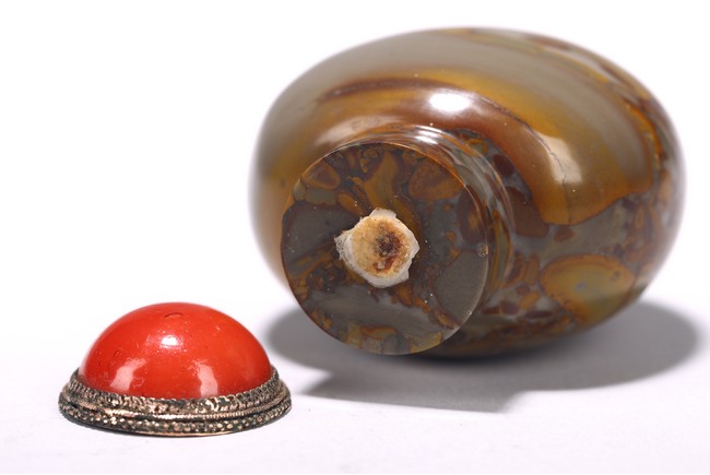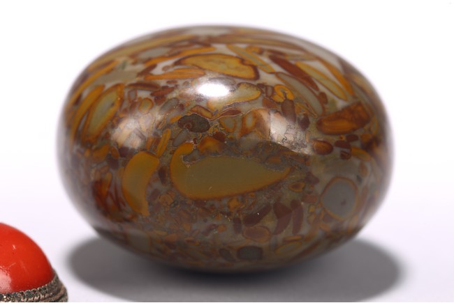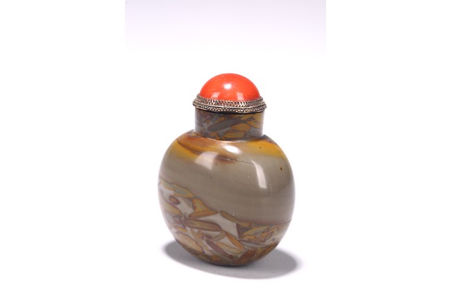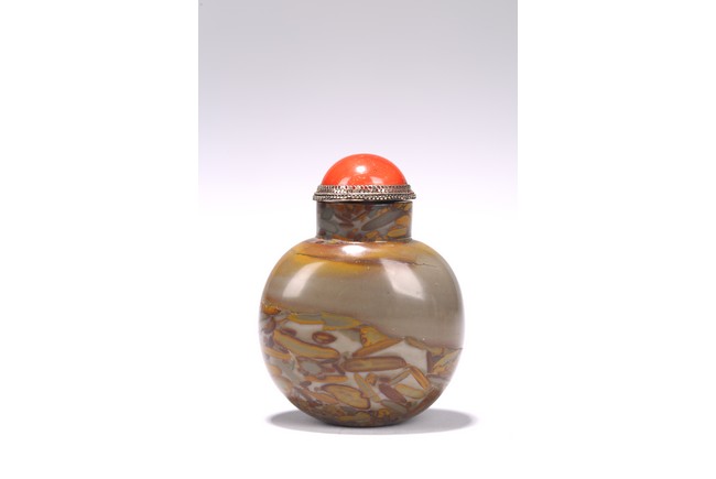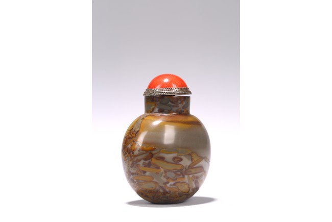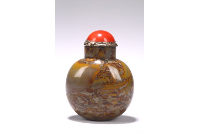 Of rounded form, the body and neck composed of attractive large and small russet, yellow, brown, orange reminiscent of 'pebbles' and 'rocks', fitted with stopper. Qing Dynasty period.