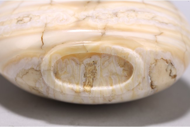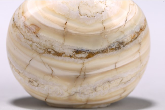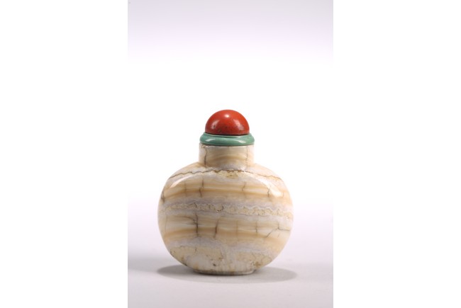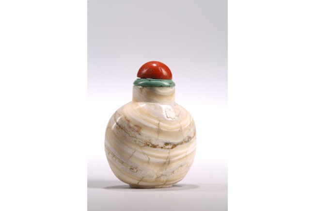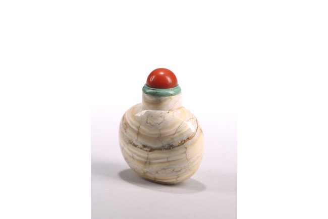 Of rounded form, the snuff bottle with attractive natural colored bands, fitted with turquoise and coral stopper. Qing Dynasty period.