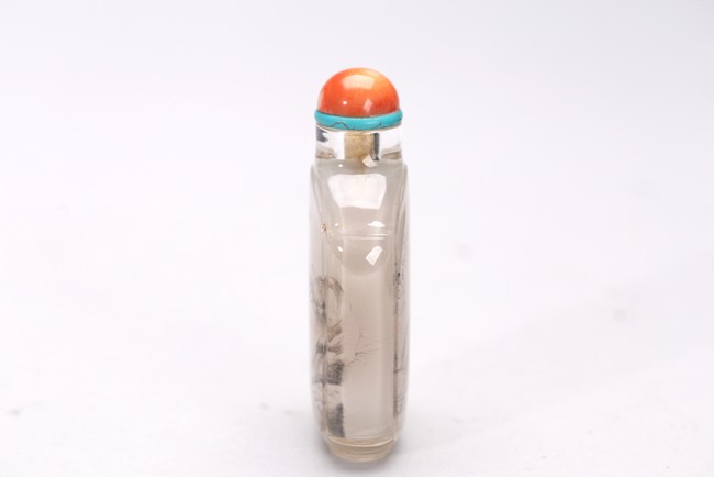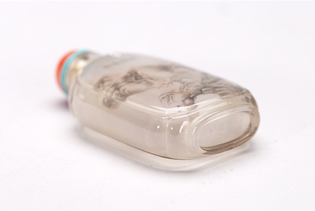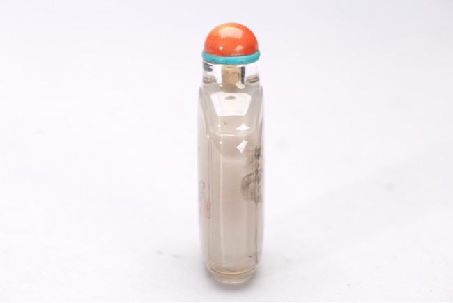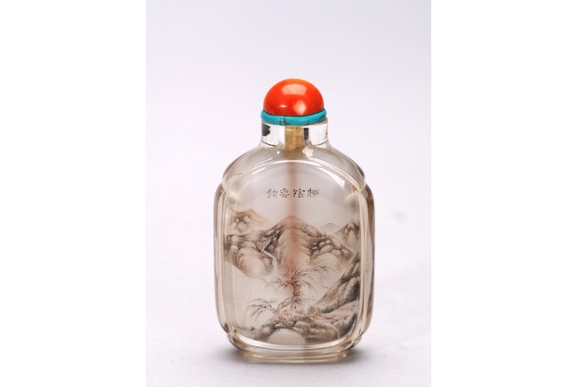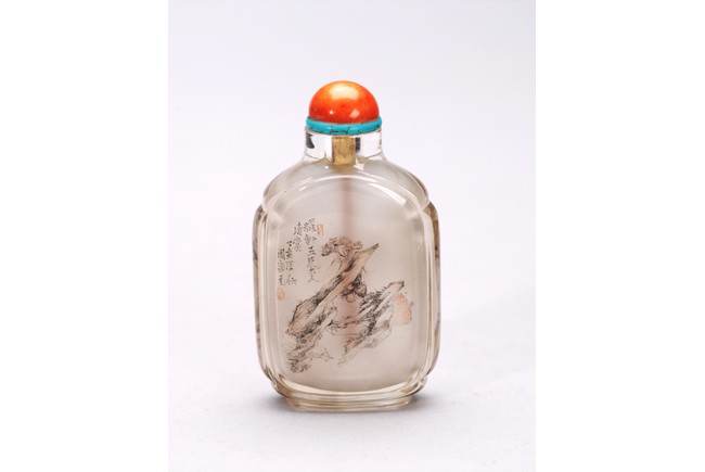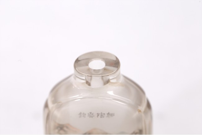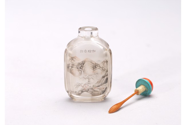 The interior painted on one side with a scholar seated and fishing in a boat beneath willows in a river landscape with pavilion and distant hills, beneath an inscription. The other side painted with vase and teapot behind a scholar's rock, with inscription above reading dedicated to Yao Xuan and dated to the autumn of 1887, signed Zhou Leyuan with two seal marks.