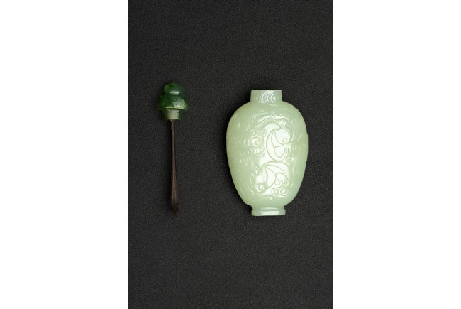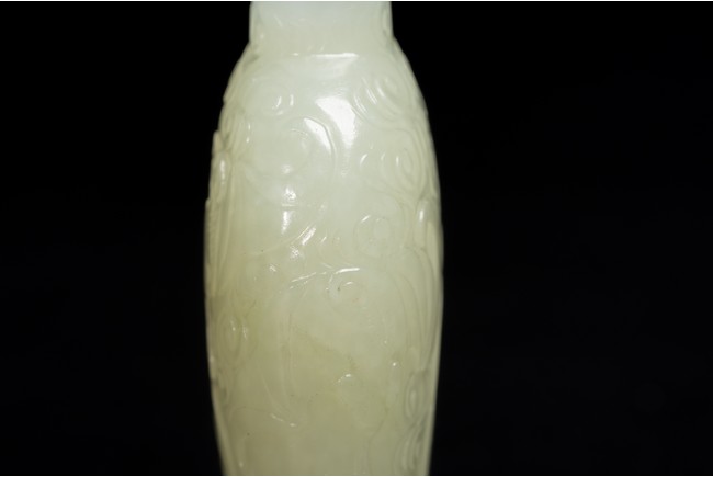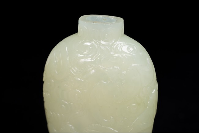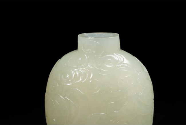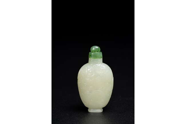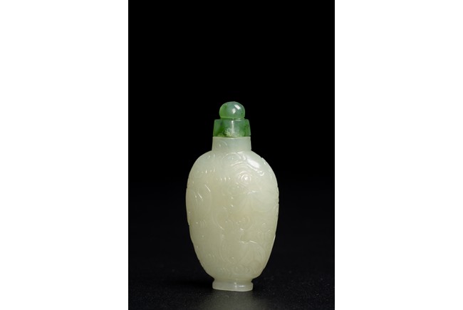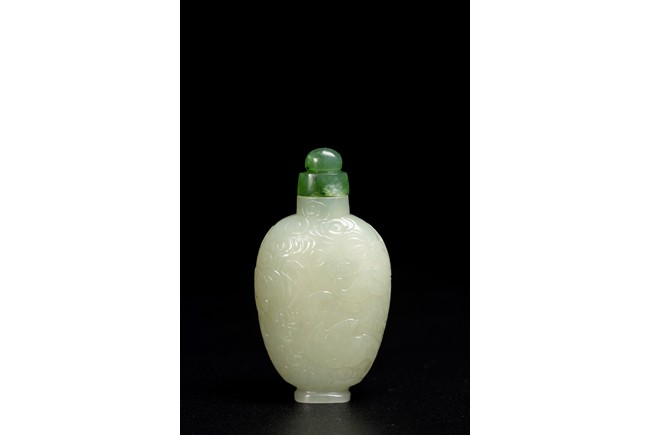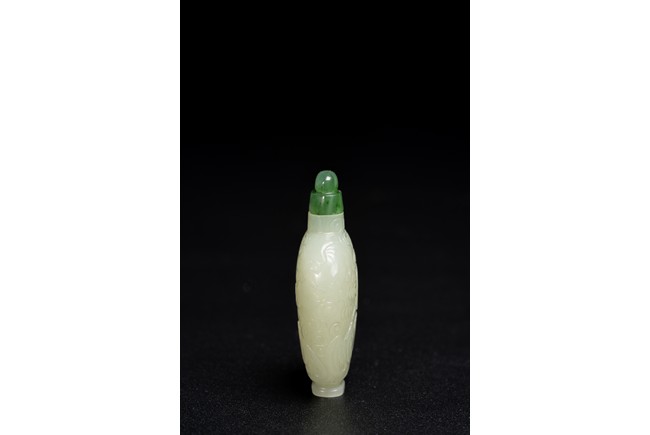 Carved around the body in low relief with clouds and bat, with green jade stopper. Qing Dynasty period.